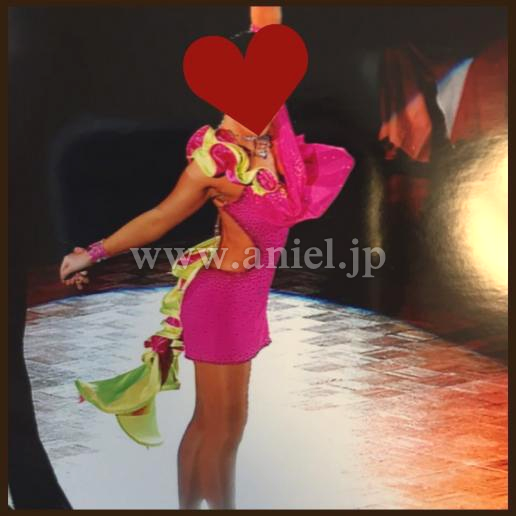 背中はあいておりますが、大きめのオーロラのラインストーンがアクセサリーでついており、首回りの飾りと繋がっています。