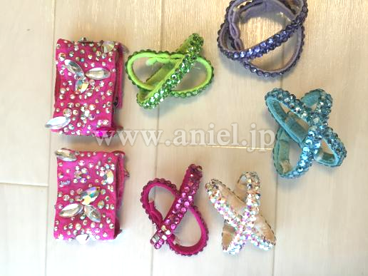 腕輪は五色の細い腕輪が計10本と、ピンクの大きめの腕輪2本がついております。