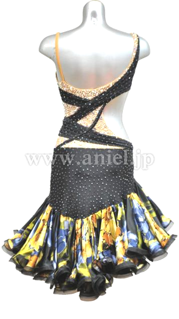 ベージュに黒のラインのセクシーなボディに花柄のスカートが個性的なドレスです。Aラインのフリルスカートが踊るとよく舞います。ボディのベージュ部分にはスワロフスキーストーンがたくさん散りばめられていてゴージャスです。
