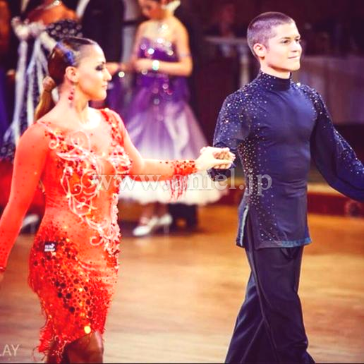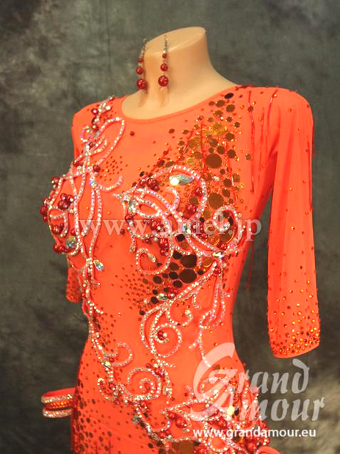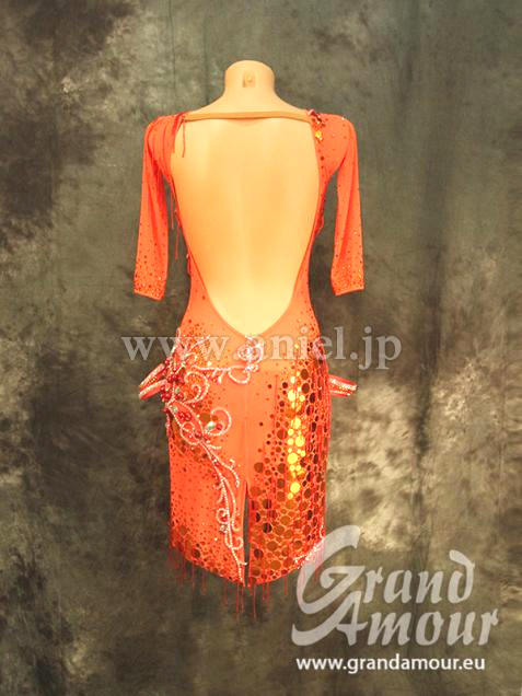 Grand AmourがスポンサーしているイタリアのSabrina Manziのスポンサードレスです。中古ですが、着用回数はおそらく2〜3回。メーカーによるメンテナンスが行われているため美品です。長袖だったのを5部袖にしました。腕が一番長く見える袖の長さです。覆い隠されたデコルテと大胆に開いた背中のコントラストが印象的です。美しいハンドメイドレースがシンプルなドレスをゴージャスに演出しています。タイトな膝上のスカートですが、スリットがあるので開脚などは問題ありません。ビーズフリンジも付いているので、動きをサポートしてくれます。アクセサリーは腕輪6つ、ピアスです。