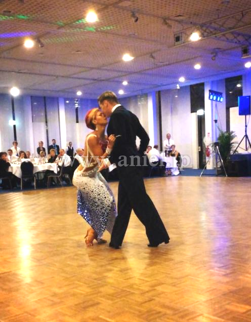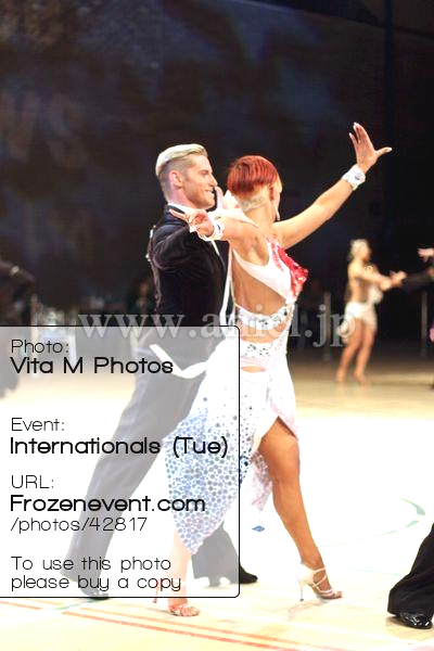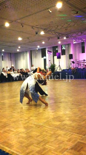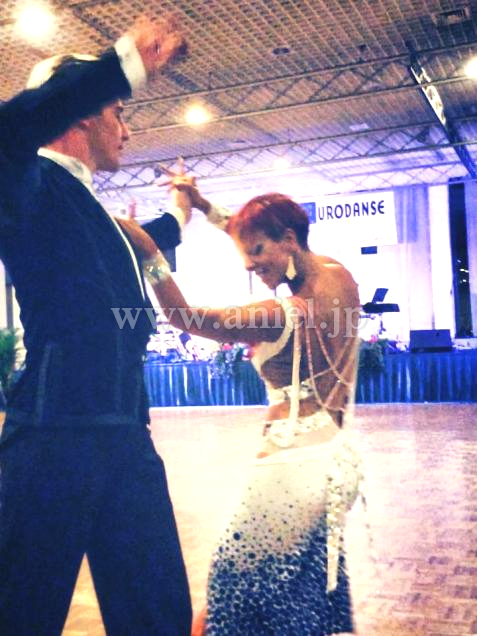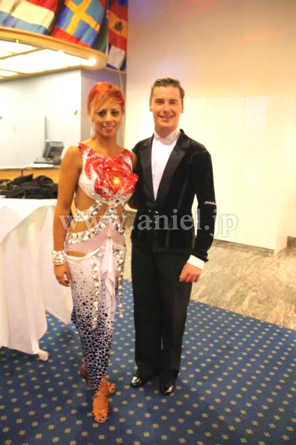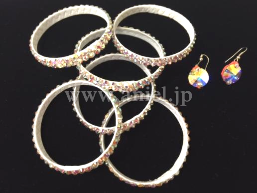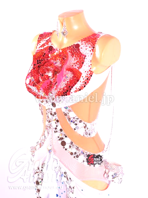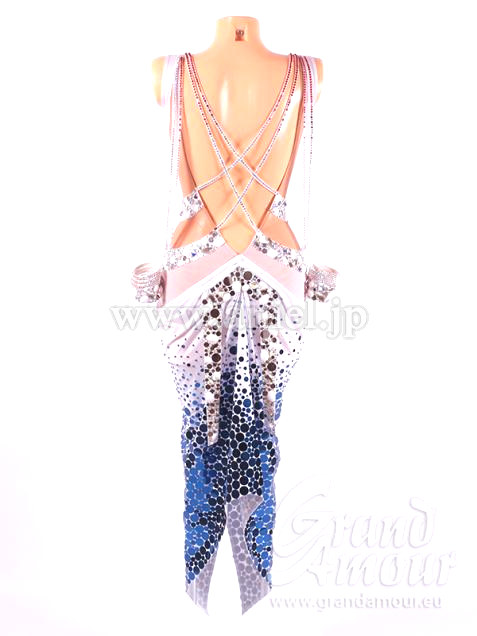 Grand Amourのスポンサードレスです。胸元に大きなバラの立体モチーフ。裾にはブルーのグラデーションが施されていてカラーのバランスがとても美しいです。前後のセンターが大きく割れているので、足を上げたり開脚するのにロングのスカートも妨げになりません。前と後ろに垂れた帯、背中にはウイングもあり、踊っていて動きを助けてくれると思います。アクセサリーは選手がつけていたものはないので、代替で新たに作成された写真のものです。腕輪6本とピアスです。
