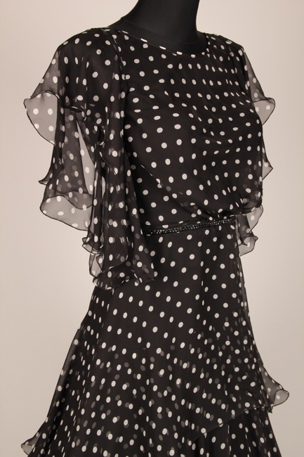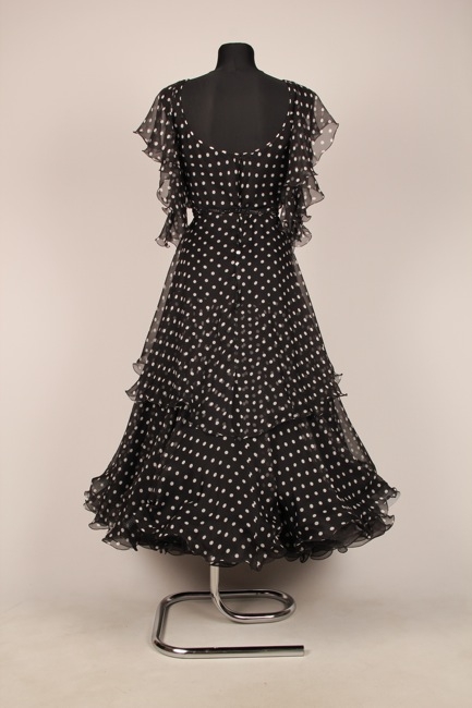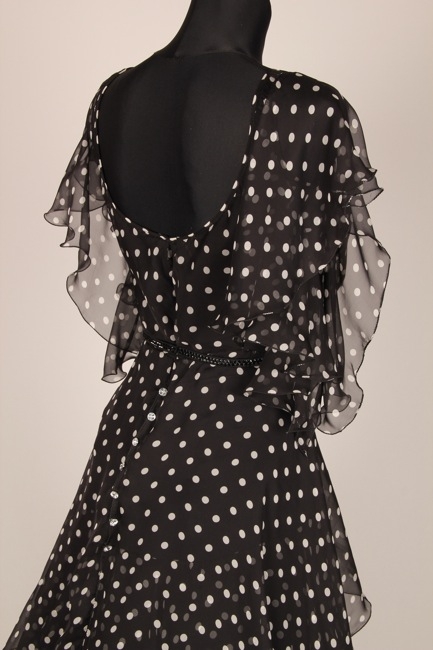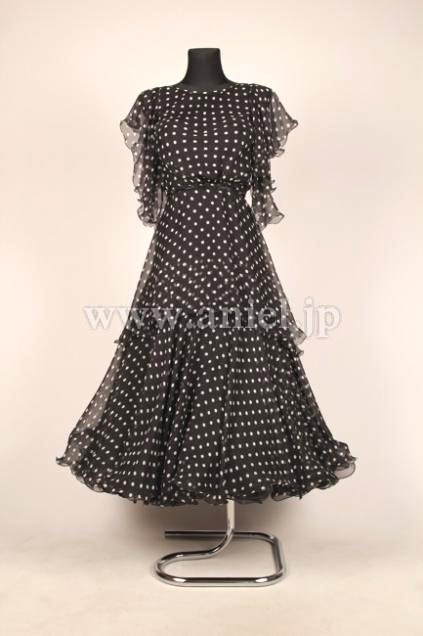 黒地に細かいドット柄がキュートな一着です。上品ながら上質の布が使われたスカートはボリュームたっぷりでよく踊ります。