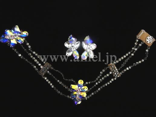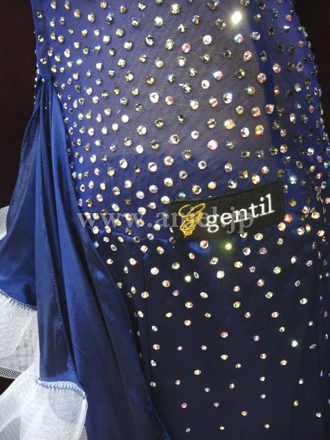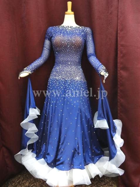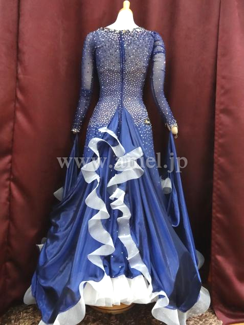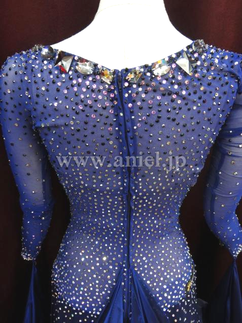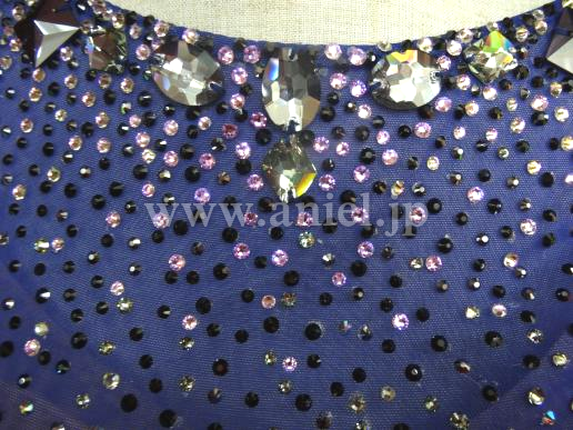 石はドレス全体に付いています。衿ぐりと袖口に付いた大きな石が特にキラキラ光ります。スカートはとても軽いので踊りやすく白のホースヘアーがネイビーとのコントラストで目立ちます。腕や背中は出ないので露出したくない方にお勧めですが上半身は透けるので上品にセクシーです。後ろ開き、クロッチ付き。