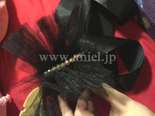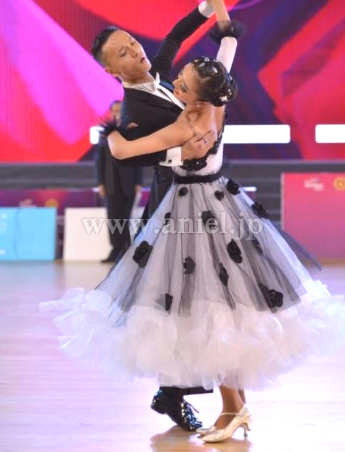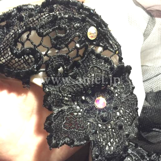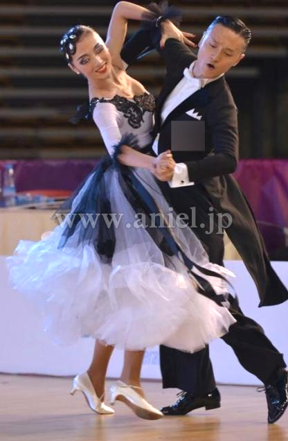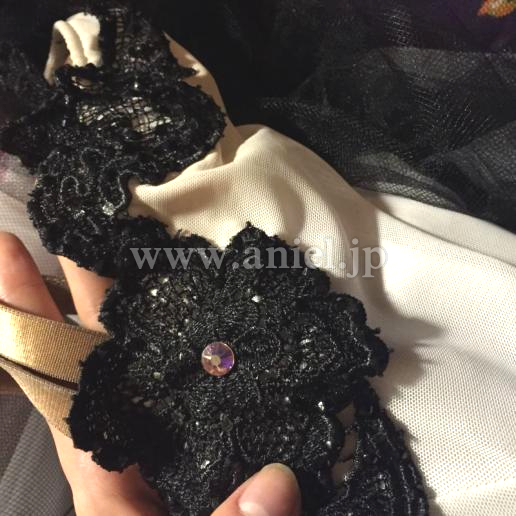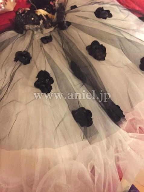ホワイトのプリンセスラインのドレスに黒のレースや立体モチーフがあしらわれたドレスです。シンプルながらエレガントな雰囲気です。