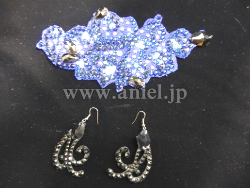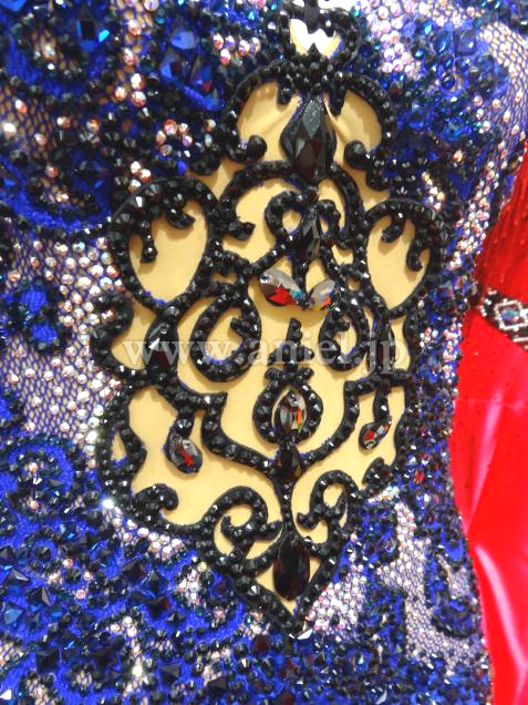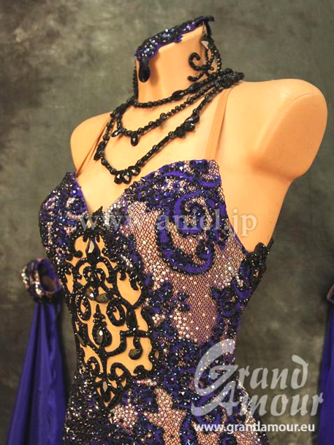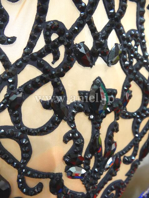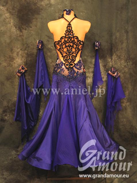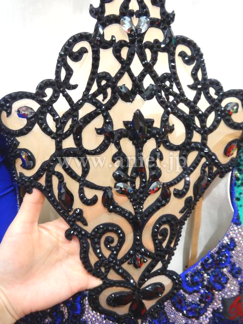 Grand Amourの2015年UKの新作ドレスです。サファイアカラーのスカートはパールシフォンと繊細なシルク生地の組み合わせ。同様にフロートもシルク生地です。ベージュのボディに描かれたサファイアカラーの模様はストレッチレースをカットして作り上げた一点もの。同様にアラベスク調の黒い模様は、Grand Amourの得意とするハンドメイドレースです。背中にインパクトがあることで、とても強そうなラインに見えます。シックでクラシカルな上品さを持ったドレスは、コンペでもデモでもフロアに映えること間違いありません。アクセサリーは髪飾り、ピアスです。(髪飾りの色はドレスと同じサファイアです。写真では色はねしていて実物とは異なります)