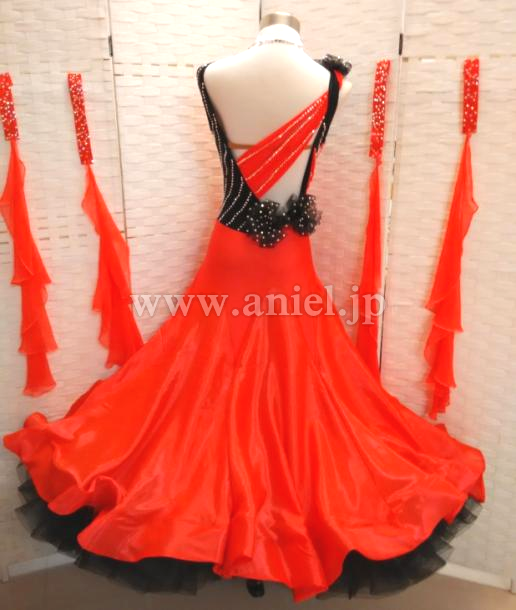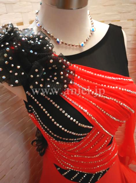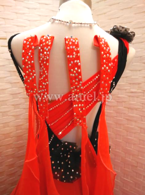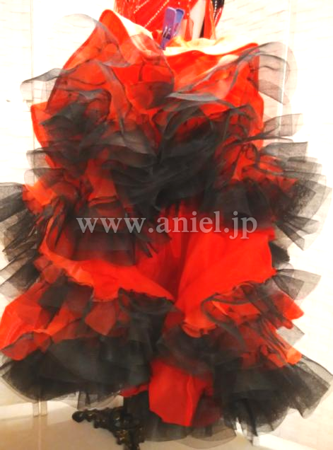 差し色の黒が雰囲気を引き締めます。 布が交差したデザインがボディを細く見せてくれます。スカートはボリュームたっぷりでインナースカートにつけられた黒のホースヘアーがよく踊ります。