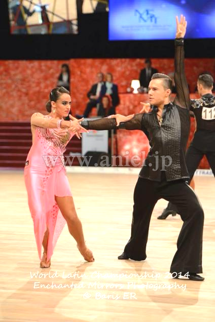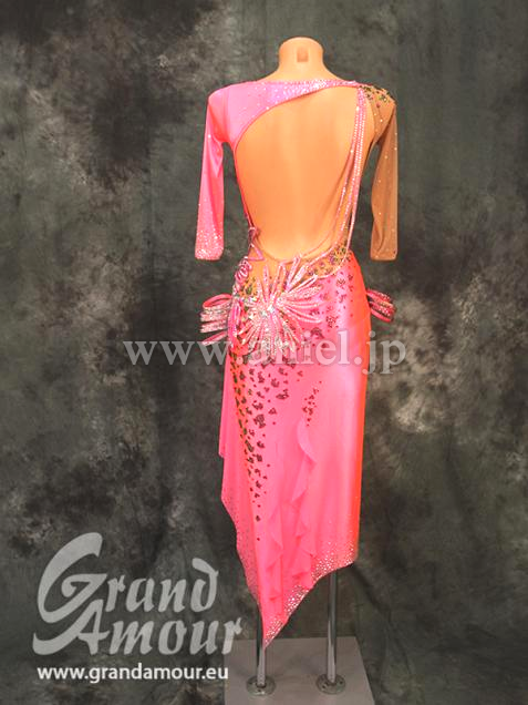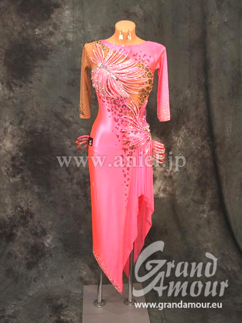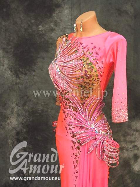 Grand AmourがスポンサーしているVera Bondarevaのスポンサードレスです。上品な光沢のあるストレッチベルベットにGrand Amourらしい3Dモチーフがあしらわれています。角度によって色がグリーン、ピンク、パープルに変化するマルチカラーストーンがついています。両袖7部、ロング、背中もそこまで出ないので、露出を気にされる方にはとてもいいデザインです。スポンサードレスらしく、とても豪華な造りになっています。アクセサリーはバングルが10本です。