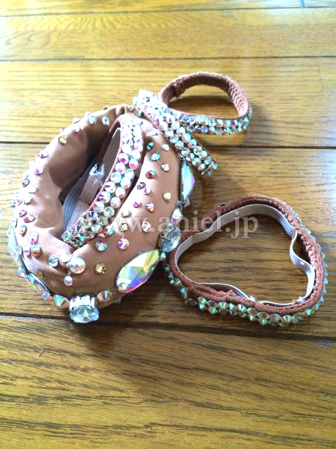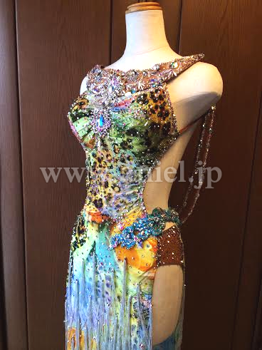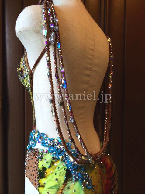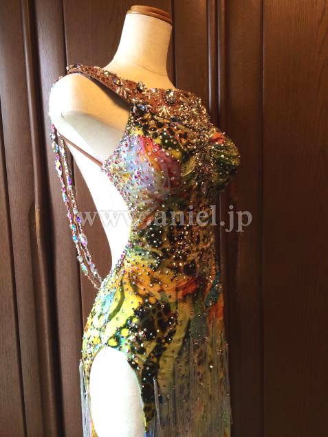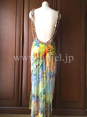 2013年にフルオーダーで製作後、リフォームしました。クリスタルクローバーの珍しい布地にスワロフスキを沢山使用しています。銀色のフリンジをスカート全体に散らし、裾には着用時に動きが出るよう重しを入れています。脚が長くスタイルが良く見えるようカットにこだわっています。背中の6本のベージュ紐は表裏前面に石を貼りました。ライトが当たるとキラキラと輝くとても素敵なドレスです。表のパンツ部分はベージュ地に石を貼っていますが中のパンツ色は蛍光イエローです。