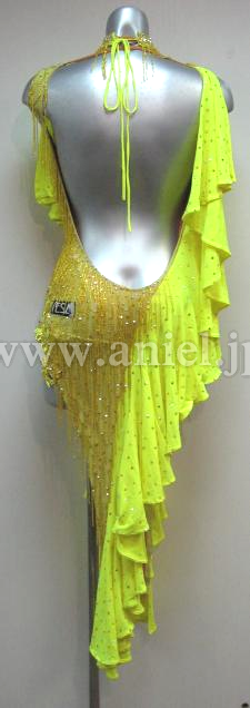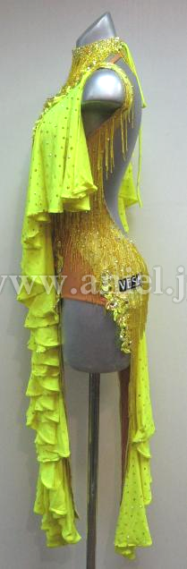 VESAらしい特別なカットのフリルが踊るとよく舞います。サイドが空いているようなデザインでベージュのボディ部分が足を最大限長く見せてくれます。ボディはストーンとビーズフリンジで装飾されキラキラと輝きます。