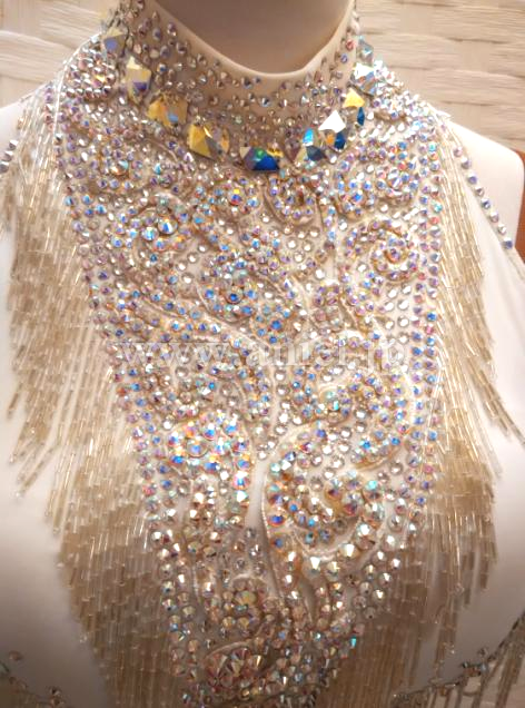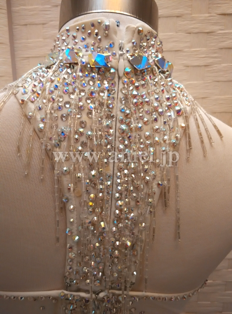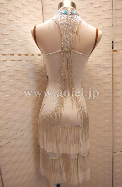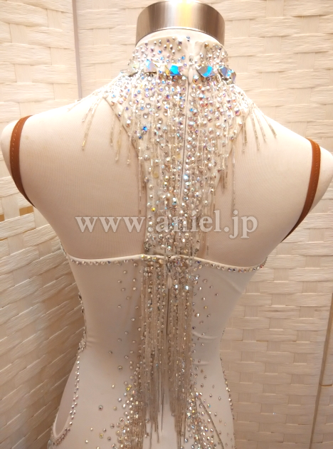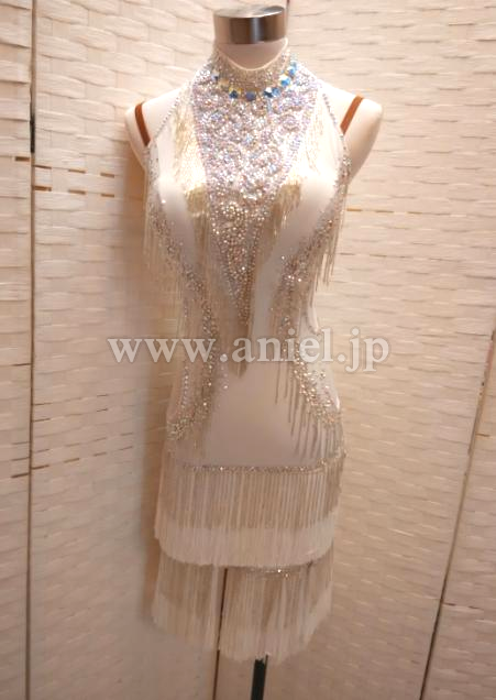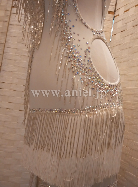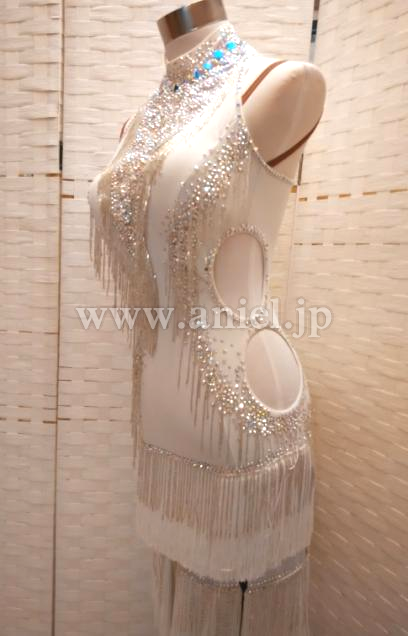 白の清楚なラテンドレスです。胸元やボディに大量のスワロフスキーストーンで装飾がされていて美しく輝きます。