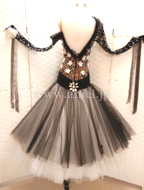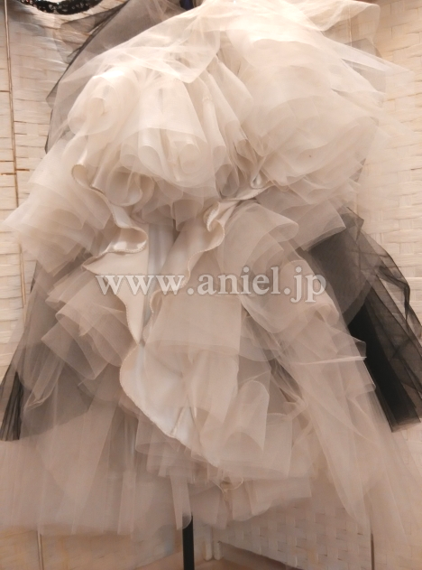 スカートは流行りのボリュームチュールで大きく舞います。一番上に重ねられた黒のチュールから内側の白が透けて見えておしゃれです。