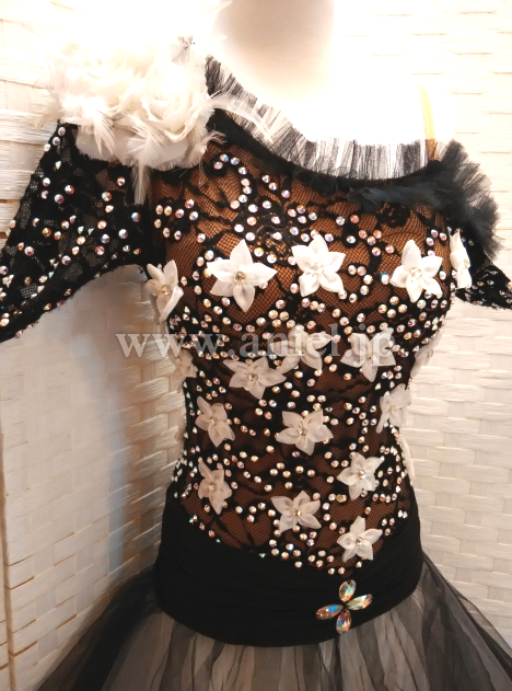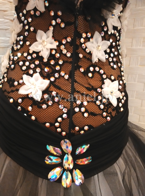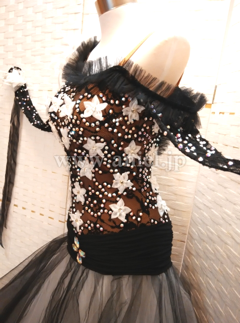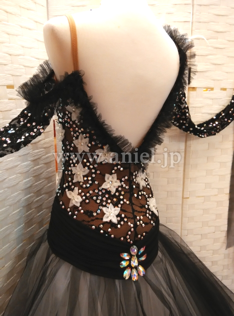 シックで上品なデザインのドレスです。ボディには黒のレースに白の花が散らされていて目をひきます。