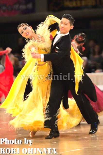 Grand Amourでスポンサーしている井之口香織先生のスポンサードレスです。胸元や肌をなるべく隠したデザインですが、全て覆わず、適度な露出があります。トップにボリュームを持ってきているため、体の薄い人にも対応します。ボディに流れるようにベージュネットを張っているため、くびれが強調され細身に見えます。手袋から垂れた大きなフロートが動きをサポートしてくれます。色はサフロンとレモンイエローの組み合わせです。このドレスで東京ダンスアカデミーで躍進賞を受賞しました。とても縁起のいいドレスです。このドレスは袖が下ろしているときは垂れ下がっていて、ホールドを張ると肩まで持ち上がって、ショルダー部分にボリュームの出る面白いデザインです。アクセサリーはイヤリングです。
