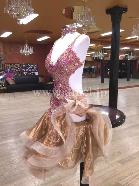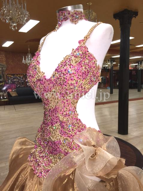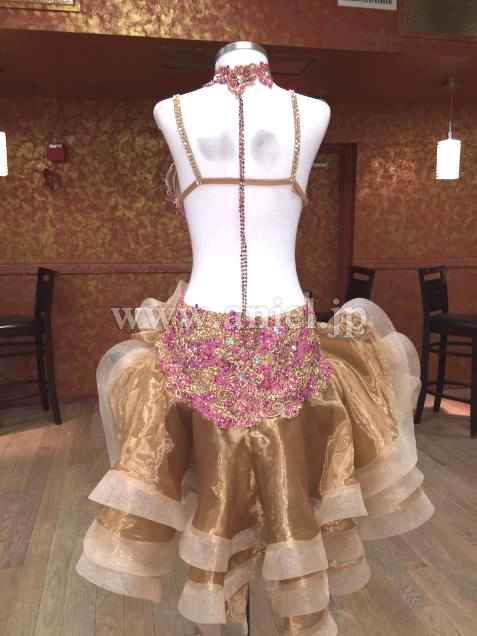 最初は短いフリンジがついていましたが、トレンドにあわせ、ホースヘアつきスカートにリメイク。リメイク後は1回しか着用していません。ティアードのスカートがよく動き、フロアに映えます。左足部分が空いているため、セクシーです。