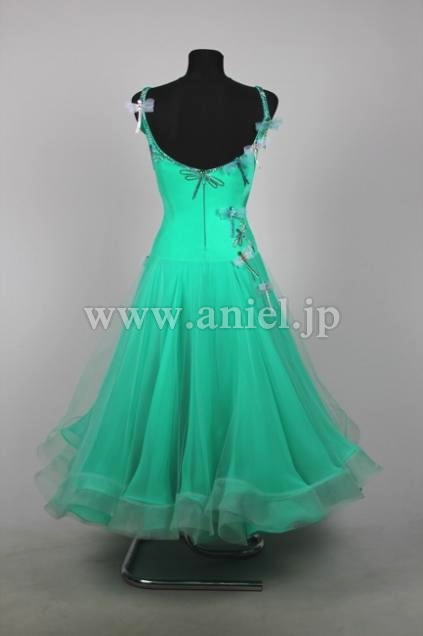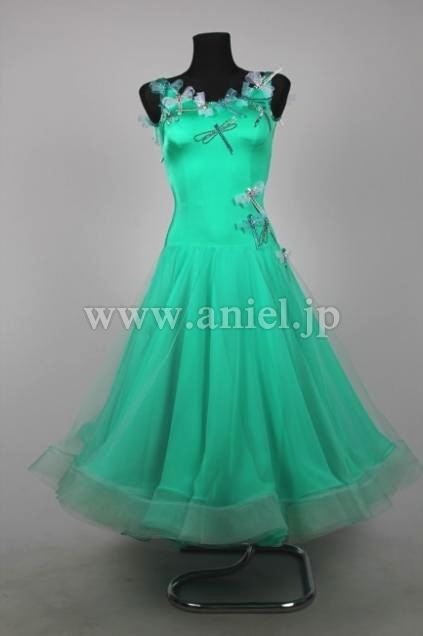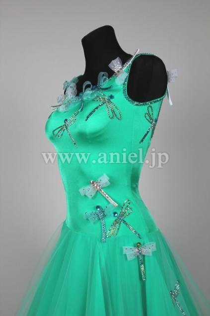 美しいエメラルドグリーンのボディに蜻蛉の立体モチーフがたくさん散らされている個性的なデザインです。ホースヘアーで丁寧に作られた羽根がリボンのようなデザインで可愛らしくスワロフスキーストーンで描かれた蜻蛉模様も美しいドレスです。