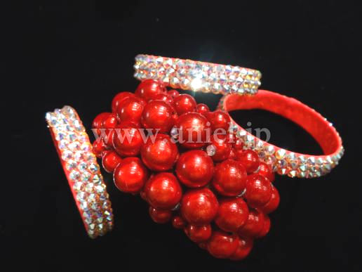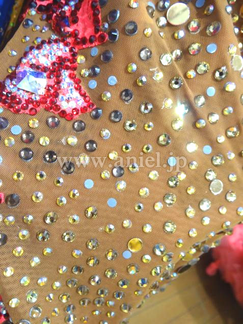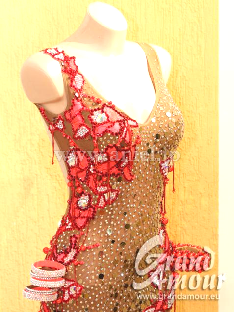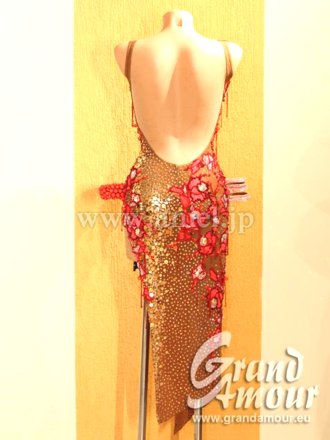 Grand Amourの中古ドレスです。状態は綺麗ですが、石取れの箇所があり格安です。ただ相対的に石やミラーの量が多いので、十分に豪華です。フロアで着用するのにはまったく問題ないと思います。ベージュですがびっしりと装飾がつき、赤のレースモチーフがアクセントとなっている大変美しいドレスです。そこはかとない存在感と、美しいボディラインを出してくれると思います。アクセサリーはバングル3つです。