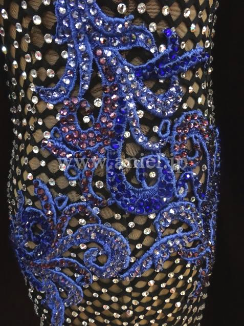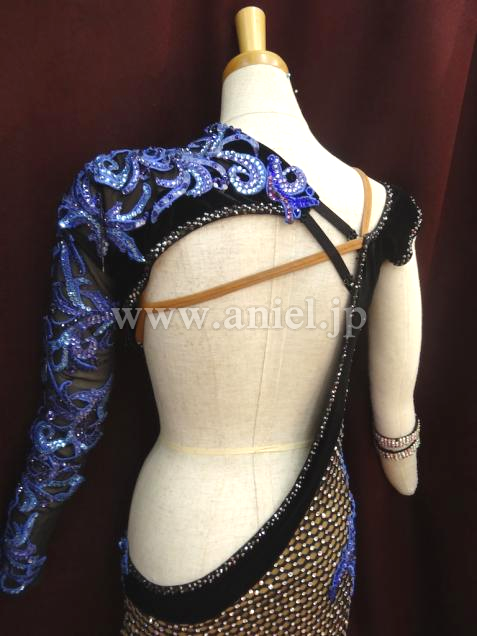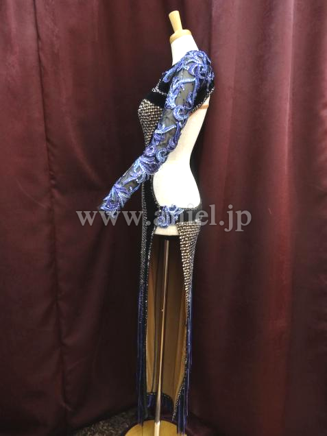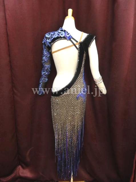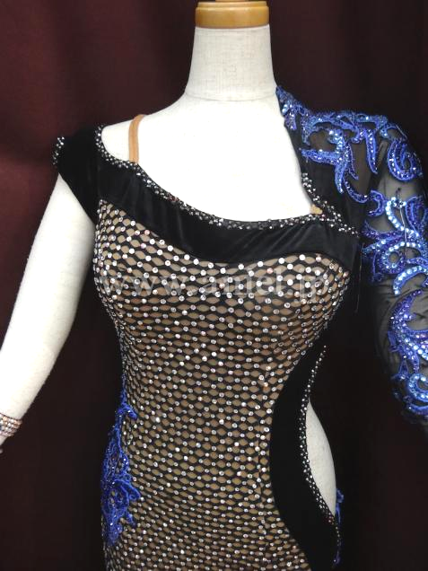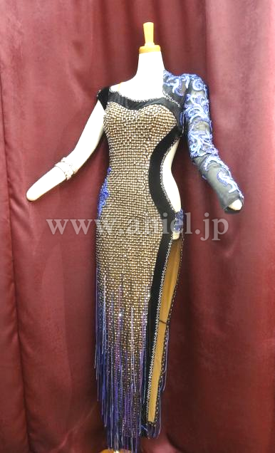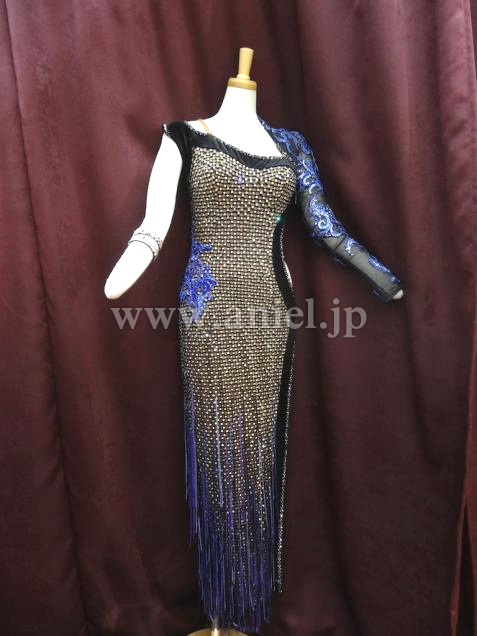 ベージュ地に黒のネットが使われたセクシーなドレスです。荒めのネット地には交差部分全てに丁寧に石が貼られています。