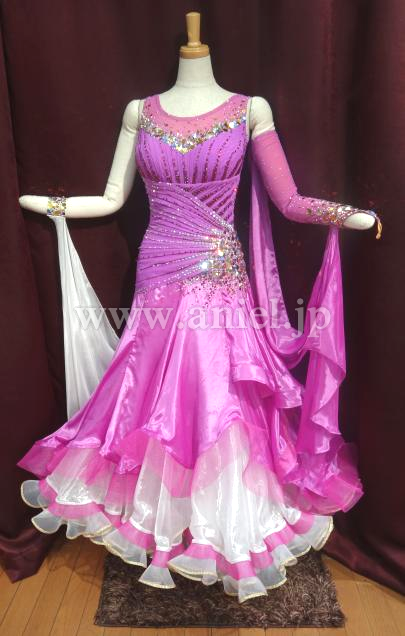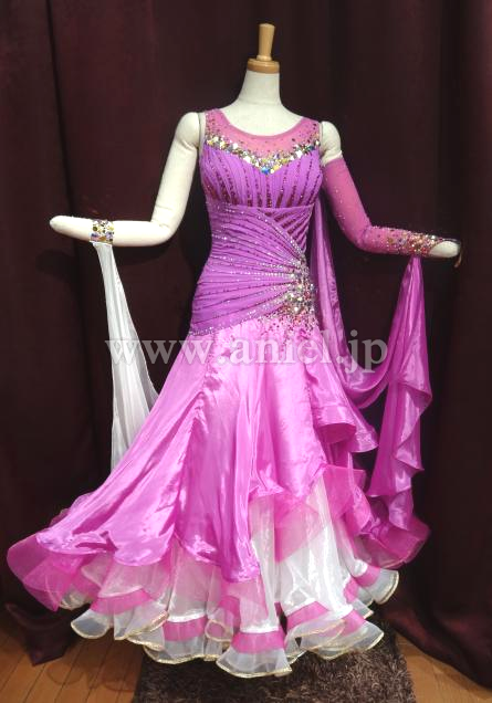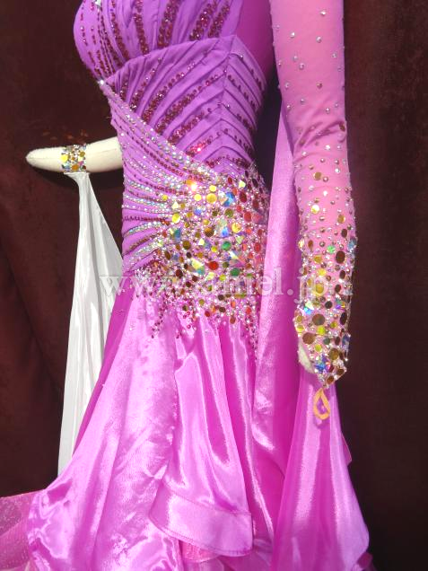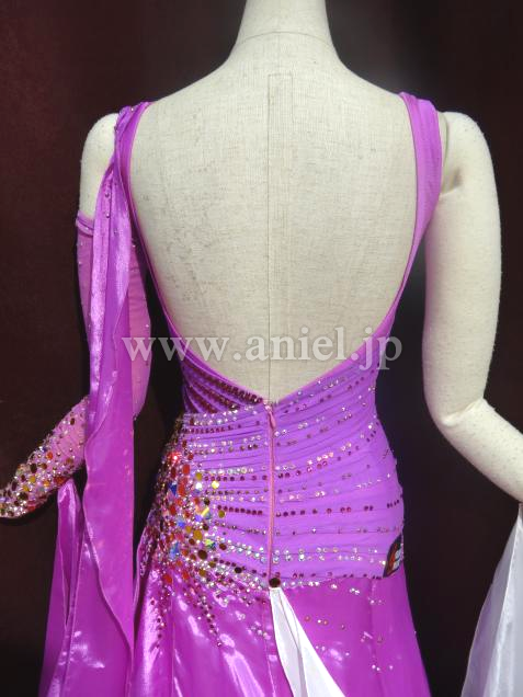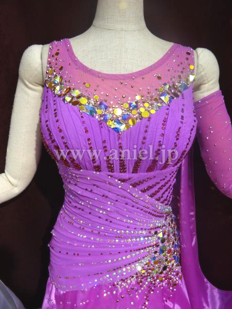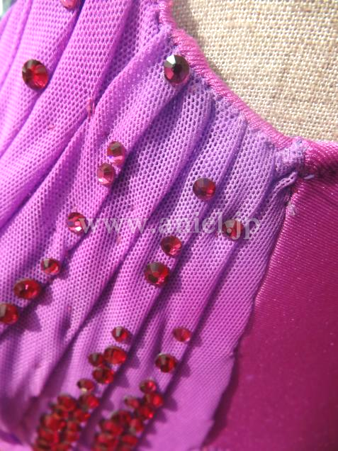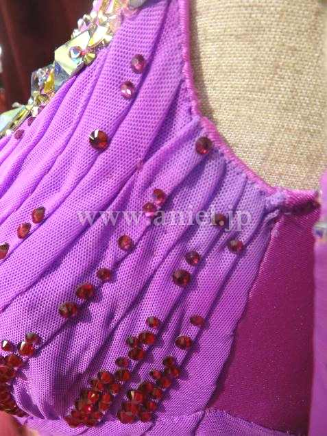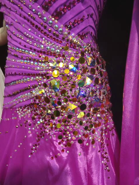 Grand Amourのオーダードレスです。ボディ部分の生地はギャザーが寄せられ身体を細く見せてくれます。ストーンとゴールドのミラーの装飾がキラキラとよく光ります。