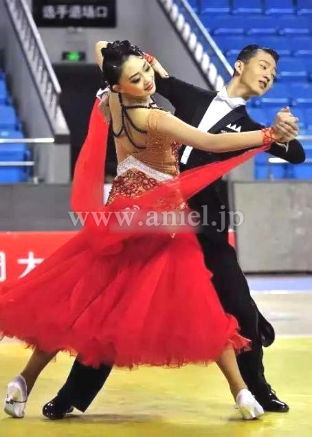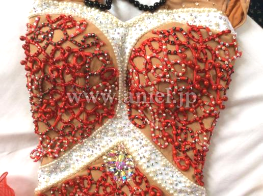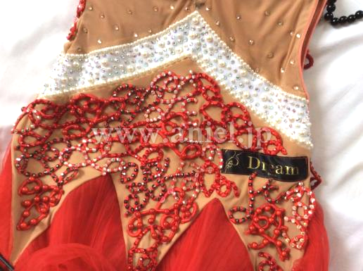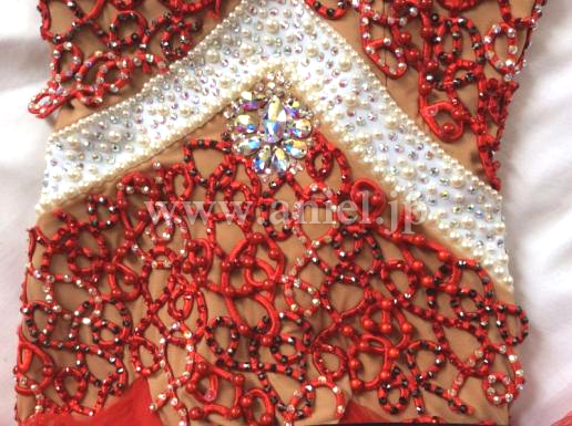 ベージュのボディ全体に赤の紐が立体的に装飾されているドレスです。