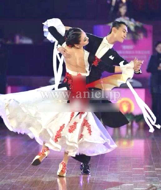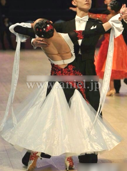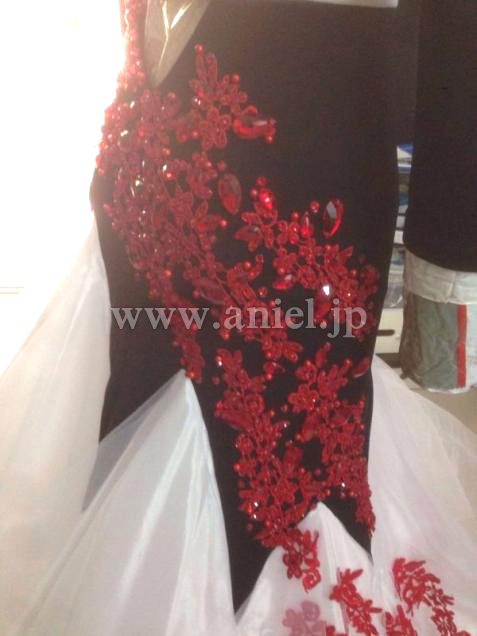 黒の七分袖に白の袖が珍しいデザインです。赤のレースモチーフはスワロフスキーストーンで装飾されています。