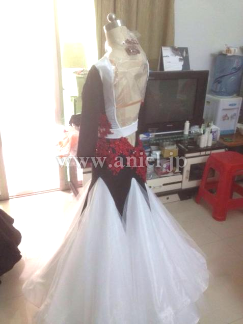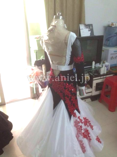 黒と白のコントラストに赤が差し色として効いているドレスです。