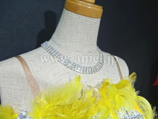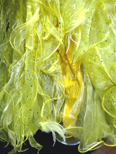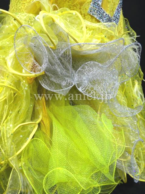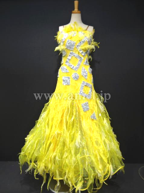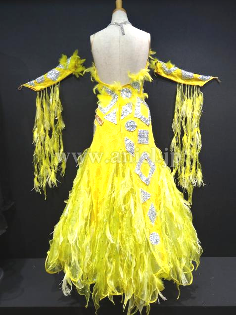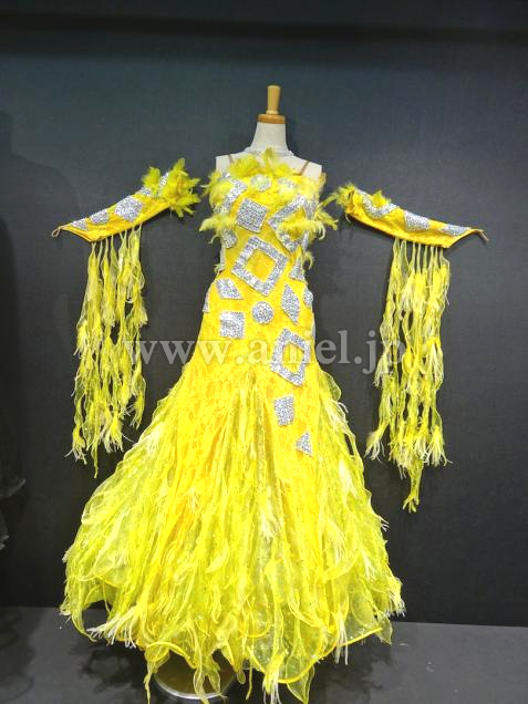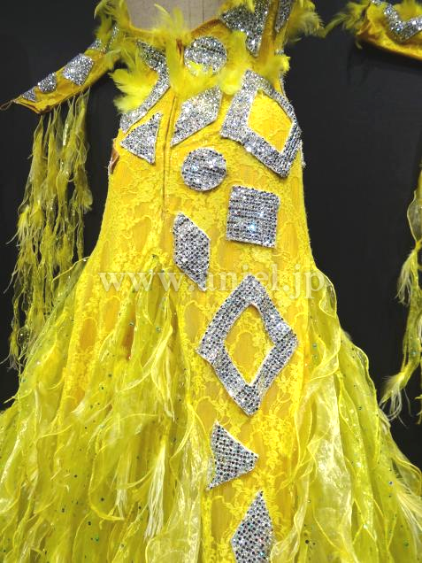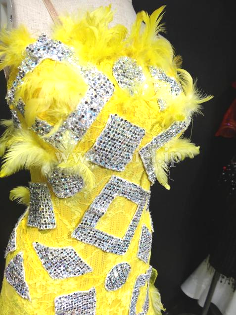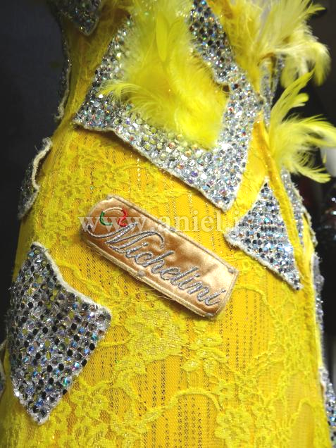 Altamoda Micheliniの中古ドレスです。今回はモデルチェンジを行なうため、在庫のクリアランスセールです。通常40万近くするドレスが一様に値下げされ、ほぼ定価の半額くらいで購入できます。多少使用感はありますが、メーカーにより手直しされているため、中古品といえども美品です。経年劣化はしているため新品同様とまでは言えませんが、状態は良好です。発色の美しい黄色いレース生地に、ひし形のモチーフが縫い付けられています。スパン生地に石が付けられているので、とてもよく光ります。スカートはスパンの付いたオーガンジー生地が使われているので、フロアでシャイニーな輝きを放つ素敵なドレスです。アンダースカートには2種類のチュール素材が使われていて、面白いです。ミケリーニらしくふんだんに羽がたくさん使われていてゴージャスです。実物はもっとキラキラしています。