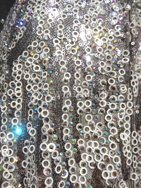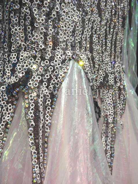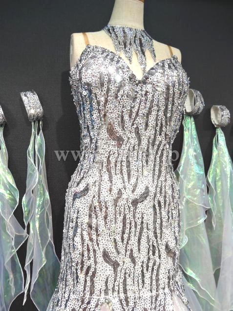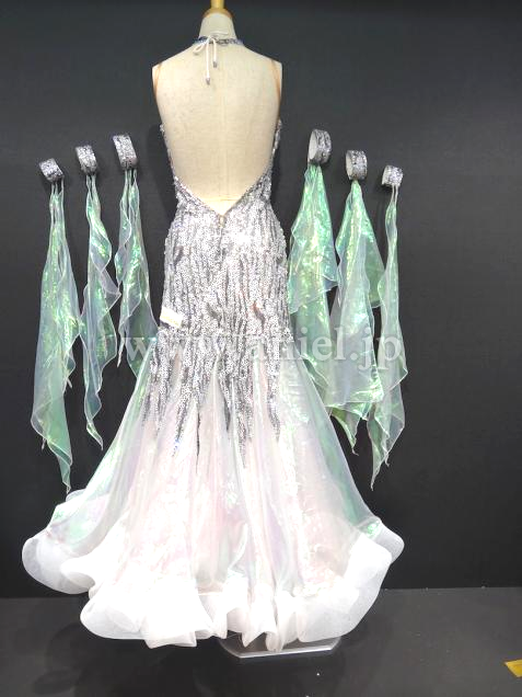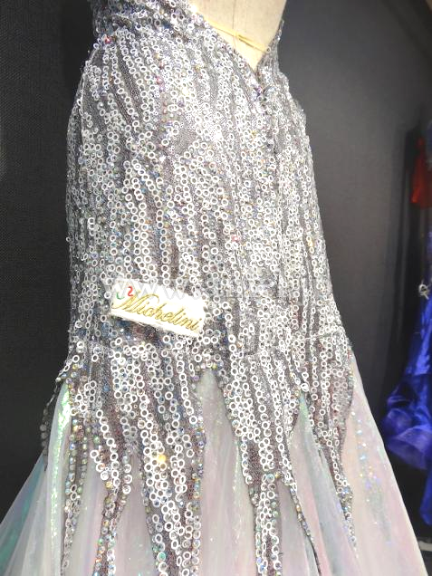 Altamoda Micheliniの中古ドレスです。今回はモデルチェンジを行なうため、在庫のクリアランスセールです。通常40万近くするドレスが一様に値下げされ、ほぼ定価の半額くらいで購入できます。多少使用感はありますが、メーカーにより手直しされているため、中古品といえども美品です。経年しているため新品同様とまでは言えませんが、状態は良好です。素敵なイタリア製の特殊なスパンコール生地が特長です。写真だとあまりよく写らないのですが、光に反射するととてもキラキラと光ります。フロートもスカートも光沢あるオーガンジー生地なので、動くと自然に光を放ちます。シンプルですが、非常にmatureで大人っぽい雰囲気のドレスです。