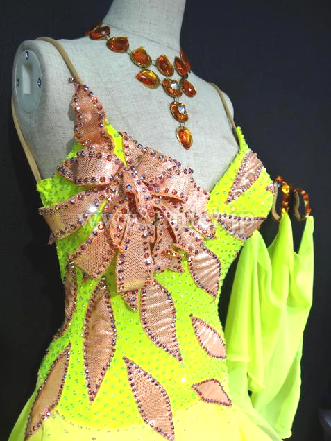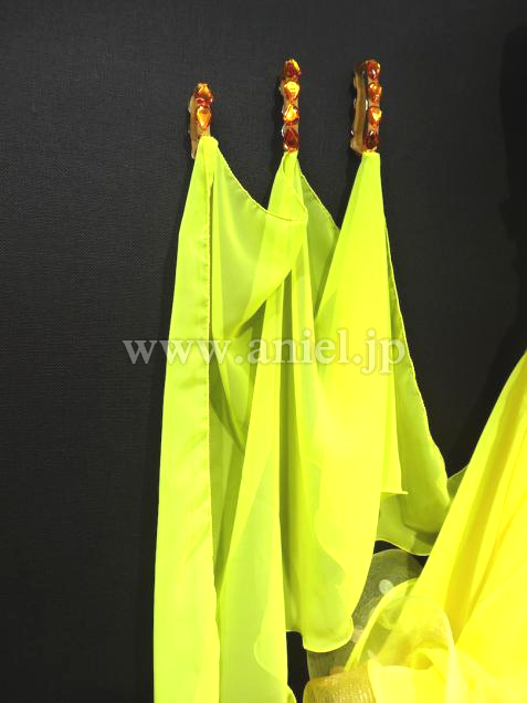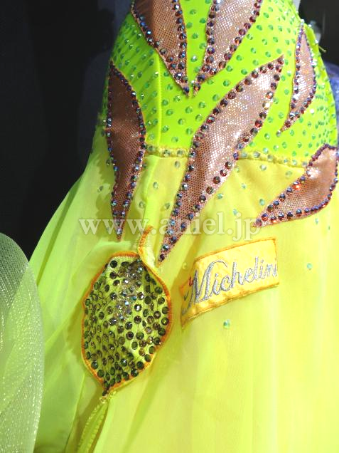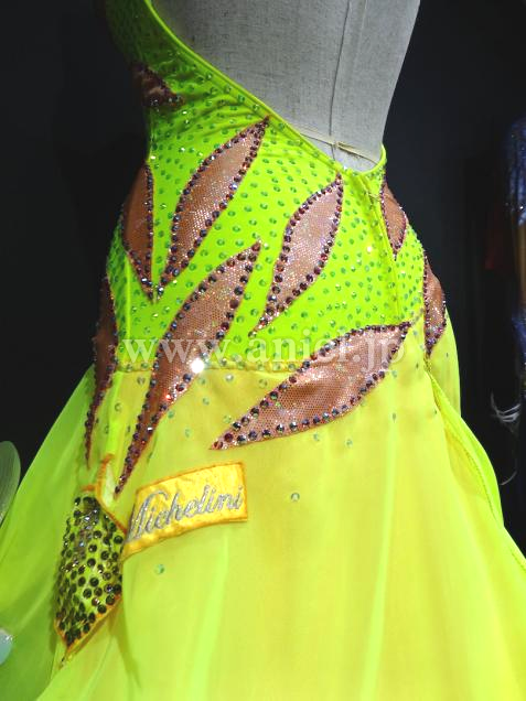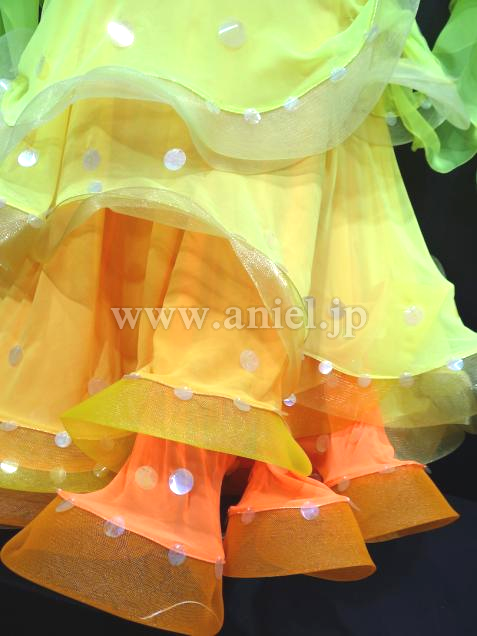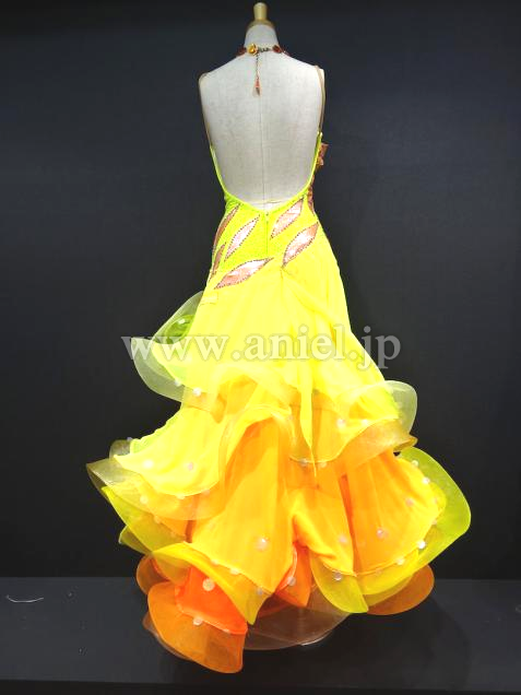 Altamoda Micheliniの中古ドレスです。今回はモデルチェンジを行なうため、在庫のクリアランスセールです。通常40万近くするドレスが一様に値下げされ、ほぼ定価の半額くらいで購入できます。こちらは新品で未着用のものですが、クリアランスでセール価格として出品します。経年していますが、劣化している箇所はないです。発色のいい黄色オレンジで、フロアではとても目に付くカラーです。写真はトップが暗く写ってしまっていますが、もっと発色のいい蛍光イエローです。上半身から下半身にかけてグラデーションになっているティアードです。胸のお花から花びらが散って、左腰の種に降り注ぐような物語を連想させるドレスです。丈が少し長いですが、ティアードなので簡単に裾上げのできるデザインとなっています。シルエットや段々のデザインがちょっと変わっていて個性が出ています。
