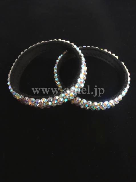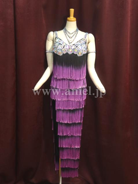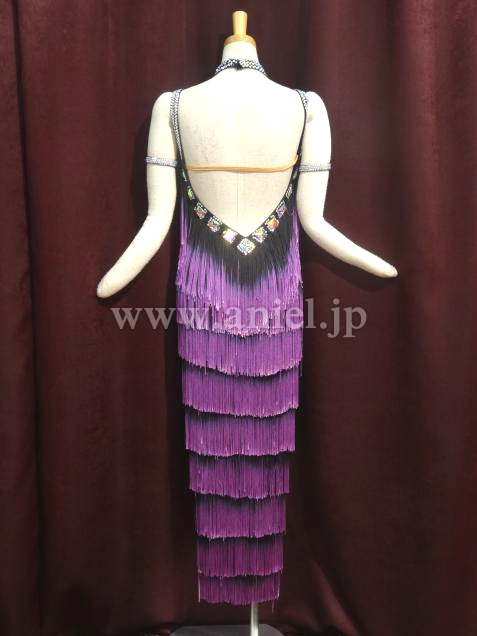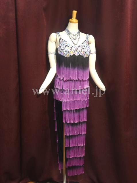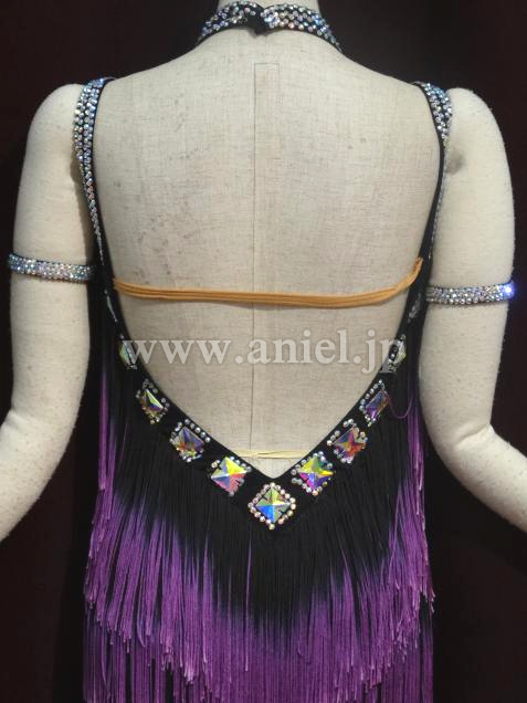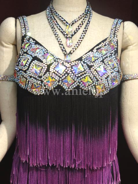 胸の部分にはたくさんのストーンがつけられています。黒から紫のグラデーションがボディを引き締めて見せてくれます。