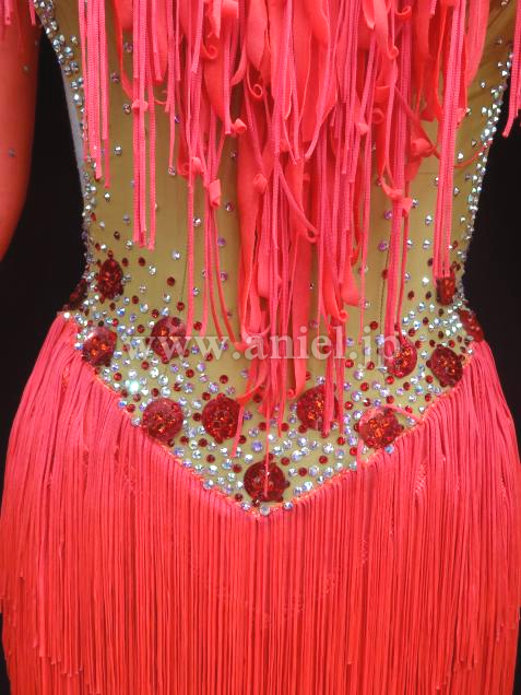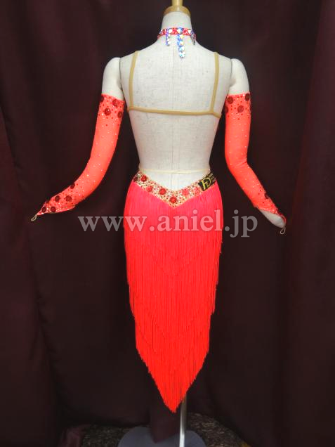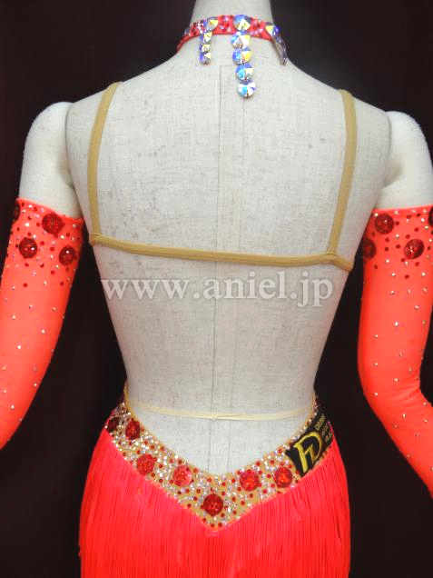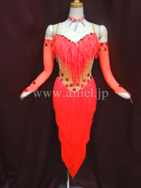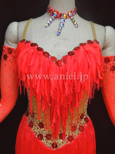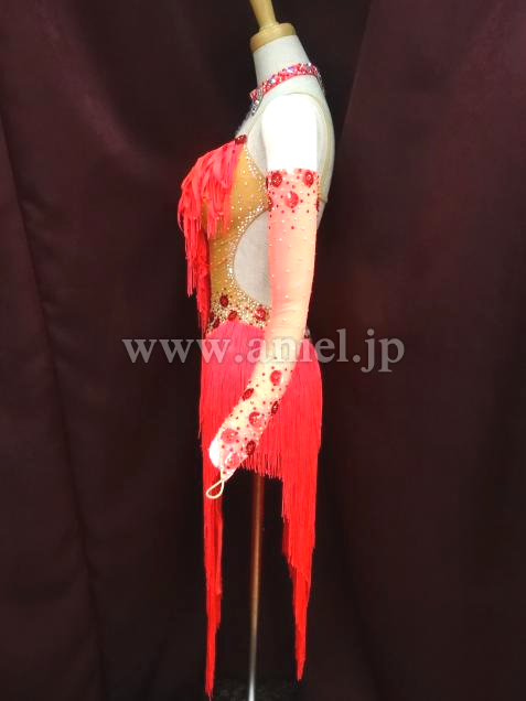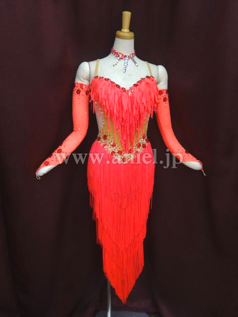 鮮やかな朱色のフリンジが、どんな会場でも引き立ちます。ボディ前部はベージュの布でお腹も隠れて着用しやすいドレスです。石取れメンテナンス済み。競技会ですぐ着られます。