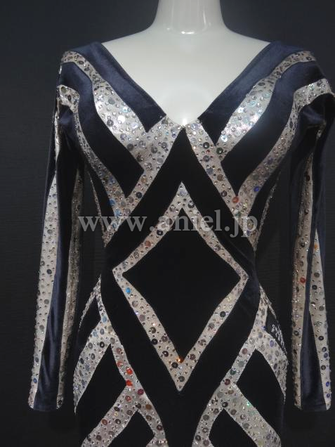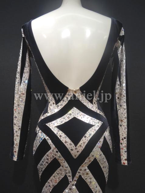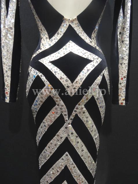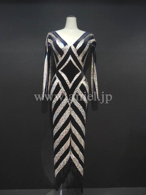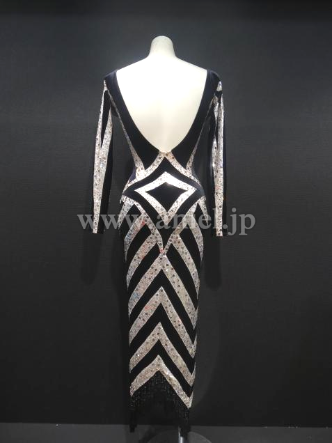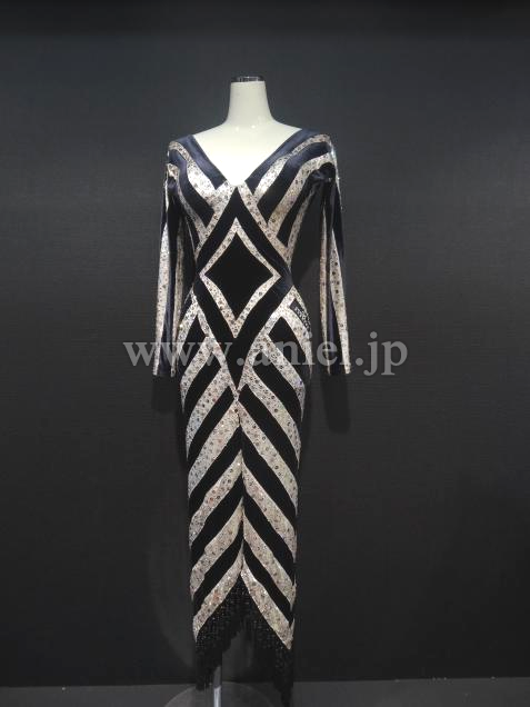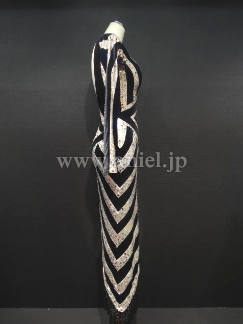 黒のベルベット生地にシルバーのラインがとてもインパクトのあるドレスです。