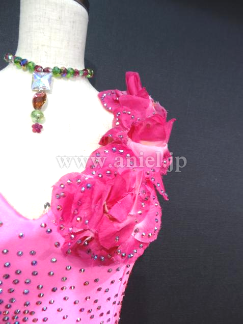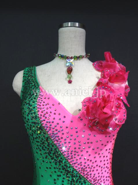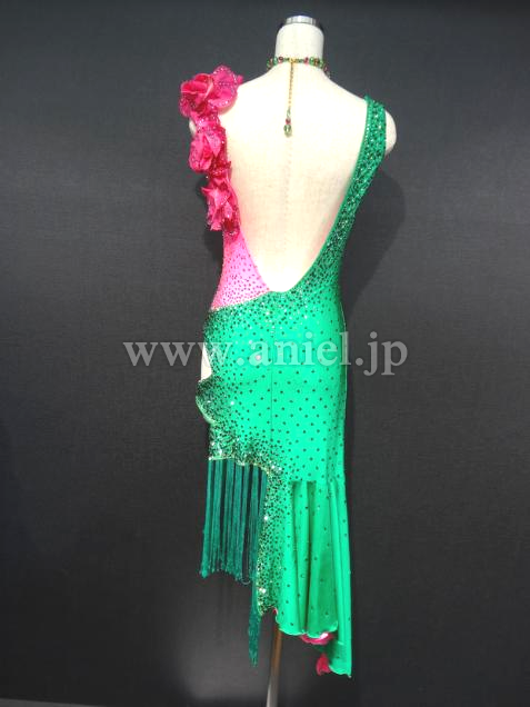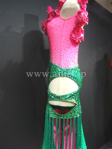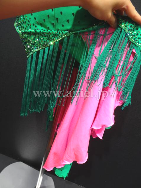 Altamoda Micheliniの中古ドレスです。今回はモデルチェンジを行なうため、在庫のクリアランスセールです。通常40万近くするドレスが一様に値下げされ、ほぼ定価の半額くらいで購入できます。このドレスは新品のドレスです。発色のいいグリーンと対象のショッキングピンクのコンビネーション。目が醒めるような美しい色合いです。左胸からショルダーにかけて付けられたお花も可憐です。左サイドのヒップは露出するデザインとなっており、セクシーです。片方はフリンジ、もう片方は布のスカート。内側はピンクになっております。新品でこの価格は非常にお買い得です。