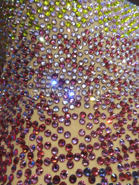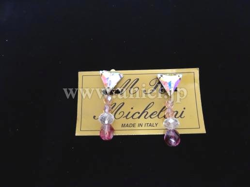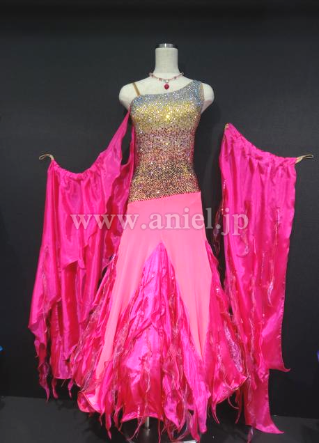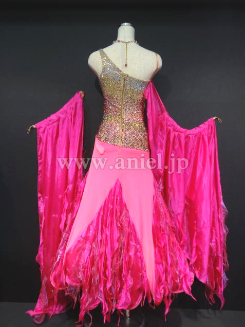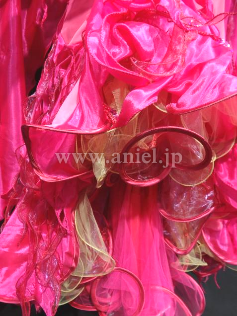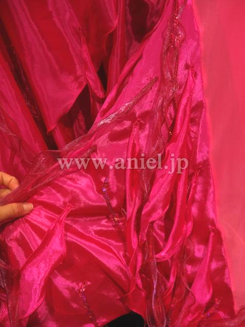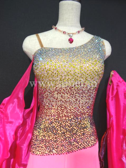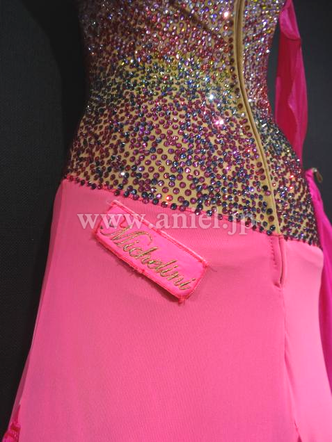 Altamoda Micheliniの中古ドレスです。今回はモデルチェンジを行なうため、在庫のクリアランスセールです。通常40万近くするドレスが一様に値下げされ、ほぼ定価の半額くらいで購入できます。多少使用感はありますが、メーカーにより手直しされているため、中古品といえども美品です。経年劣化はしているため新品同様とまでは言えませんが、状態は良好です。発色のいいピンクのスカートに、ボディはベージュにびっしりと石がグラデーションを描いて貼られています。アンdファースカートはオーガンジーとチュールの組み合わせです。アクセサリーはネックレスとイヤリングです。