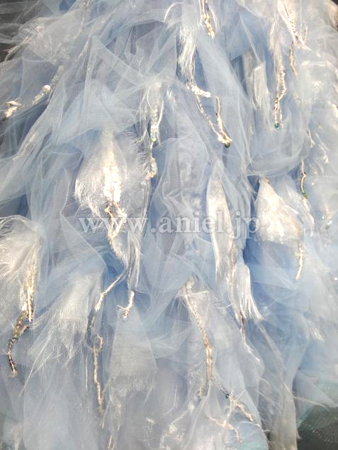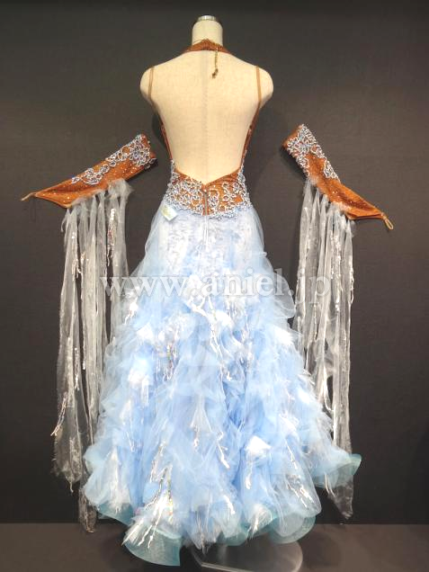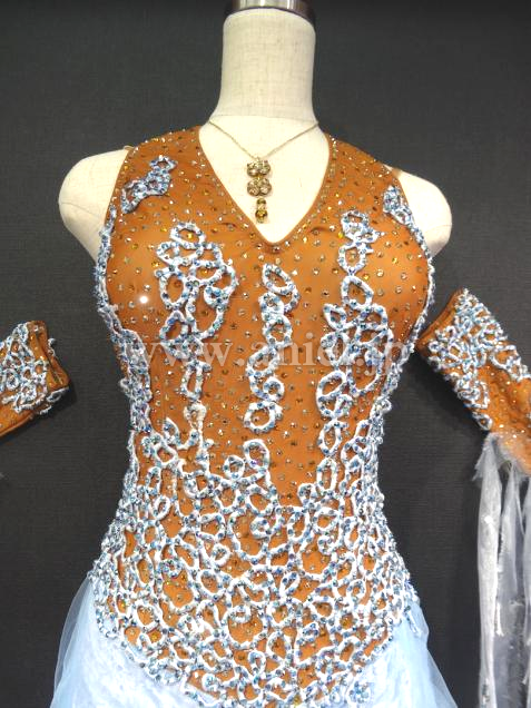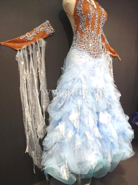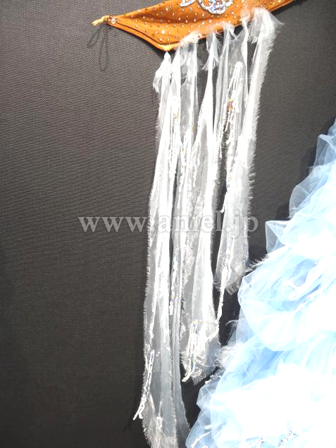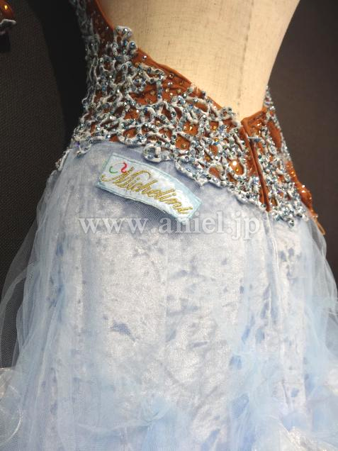 Altamoda Micheliniの中古ドレスです。今回はモデルチェンジを行なうため、在庫のクリアランスセールです。通常40万近くするドレスが一様に値下げされ、ほぼ定価の半額くらいで購入できます。多少使用感はありますが、メーカーにより手直しされているため、中古品といえども美品です。経年劣化はしているため新品同様とまでは言えませんが、状態は良好です。タンカラーのボディにモチーフ、スワロフスキーが散りばめられた上品なホルターネック、スカートは美しいペールターコイズのベロア生地の上にふんわりチュール素材がくしゅくしゅとした曲線を描いて縫い付けられています。ところどころに裂かれたオーガインジーとスパンコールが付けられています。フロートもオーガンジーを裂いたものとスパンコールが面白いです。