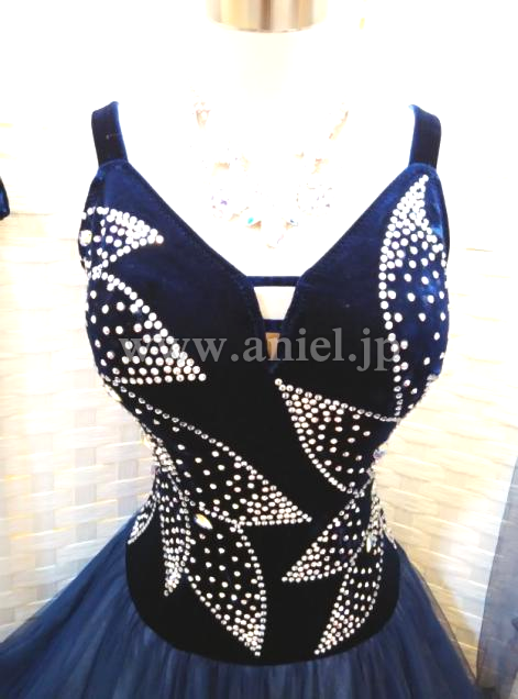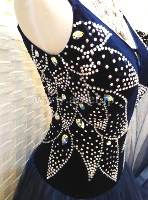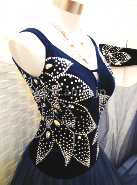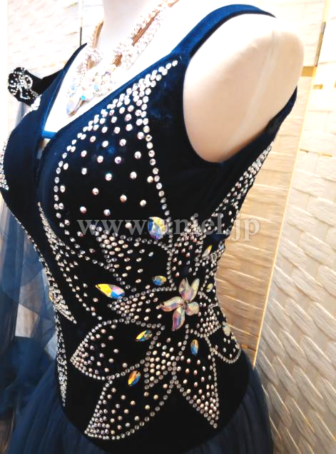 ボディはネイビーのベルベット生地が使われておりスワロフスキーストーンで大きな柄が描かれています。