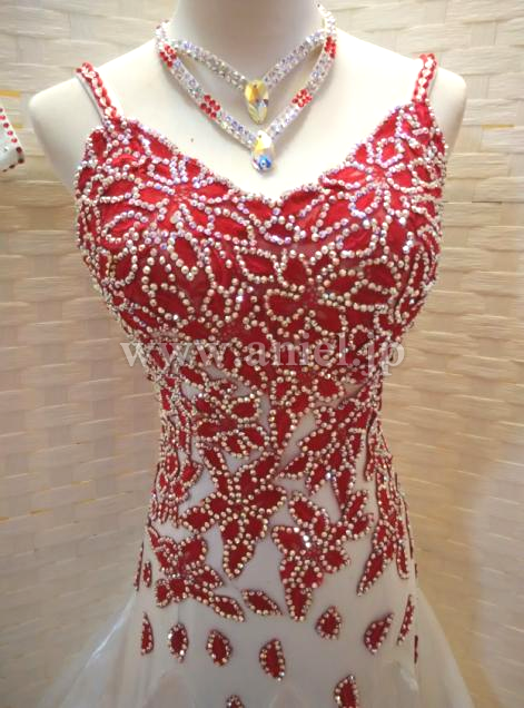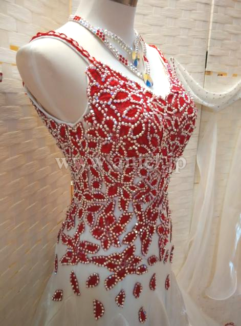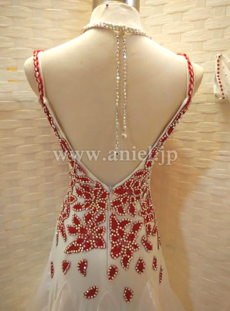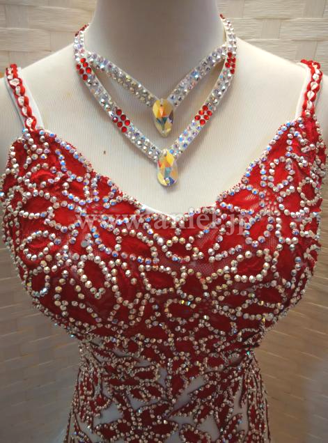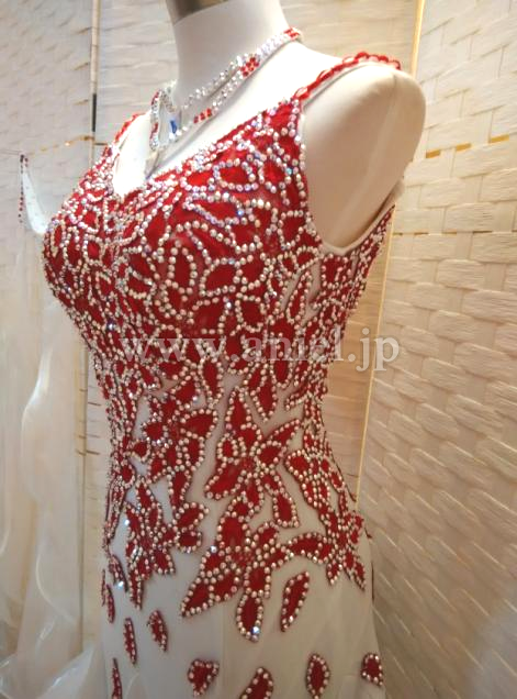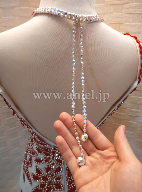 赤のレースモチーフに大量のオーロラスワロフスキーストーンで模様が江が返れており、とても個性的なデザインです。