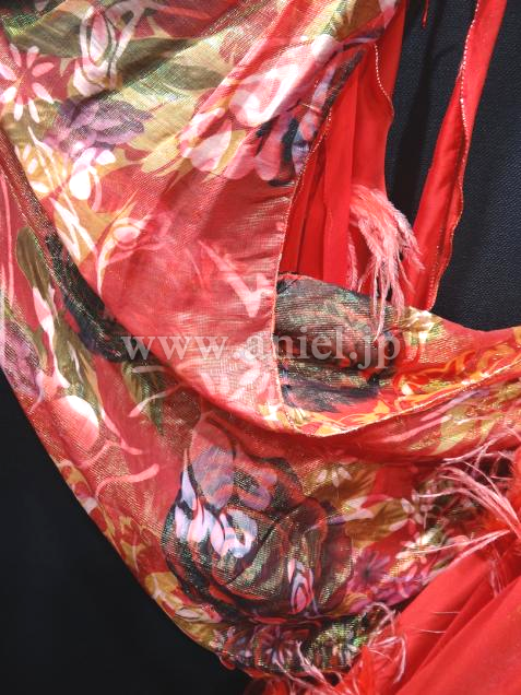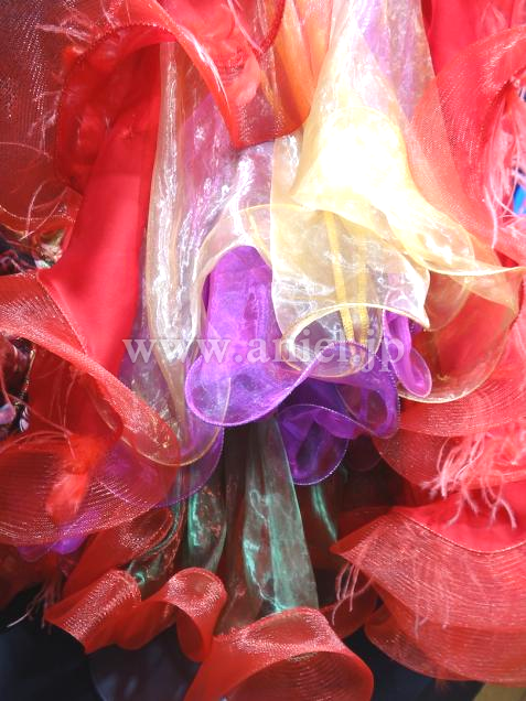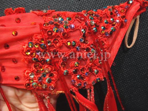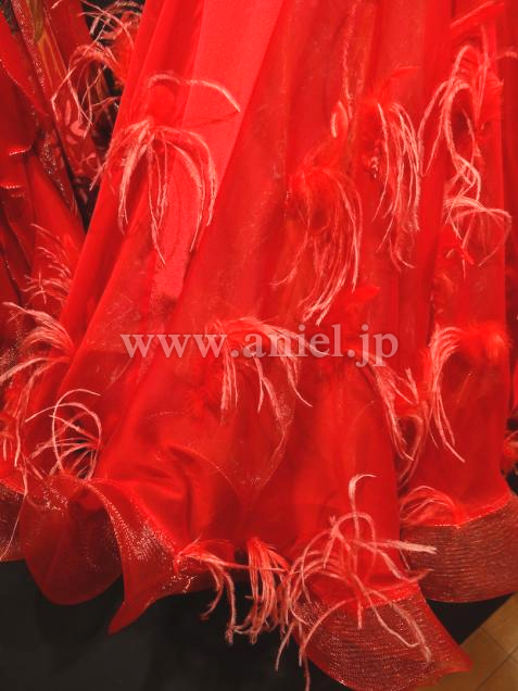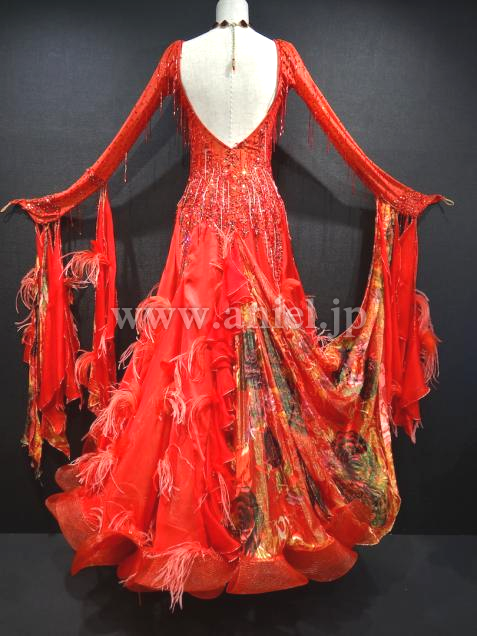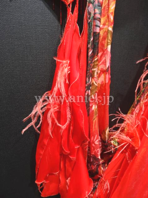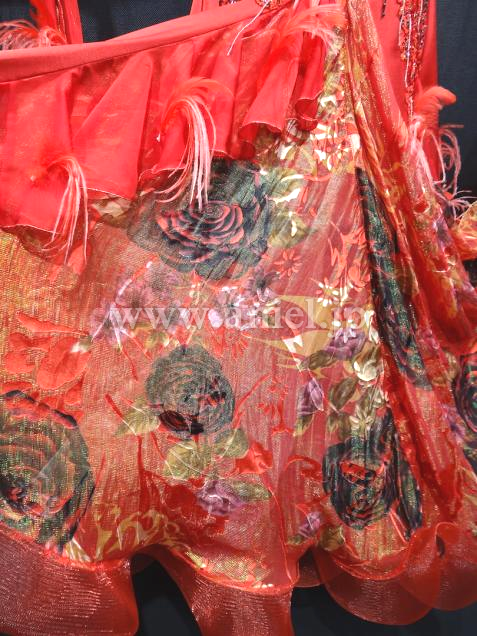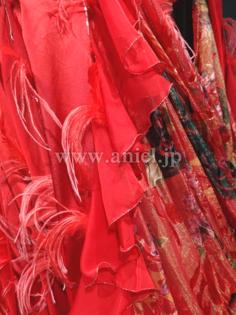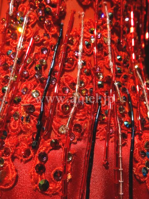 オーソドックスな形ですが、スカートとフロートにイタリア製の高級生地が使われています。写真は色がはねてしまっているのでわかりにくいのが、角度によってグリーンやパープルに光るスワロフスキーが付けられています。ビーズフリンジ、羽根もふんだんに付けられていて、とてもゴージャスです。アンダースカートは、イエロー・パープル・グリーンでとてもお洒落です。身長が170センチくらいの方向けととても大きいのですが、大柄でなかなかドレスが見つからないという人にはとてもお買い得な一着だと思います。