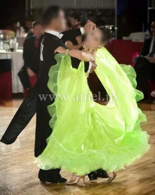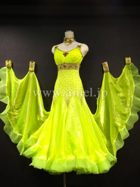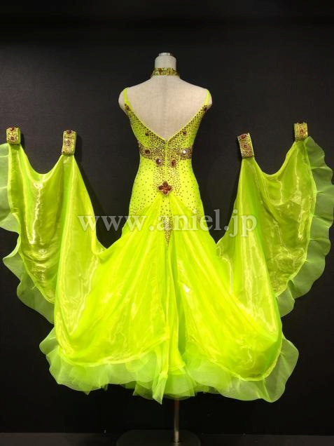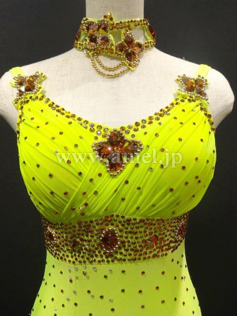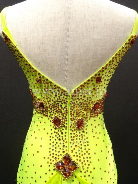 鮮やかな黄緑のドレスです。ハイウエストのポイントにストーンでベルト状に切り返しがあります。ボディはストレッチ性があり着心地がよいドレスです。全体にスワロフスキーのストーンが散りばめられ、大きなストーンもたくさん使われています。