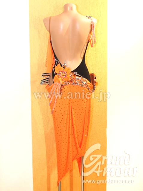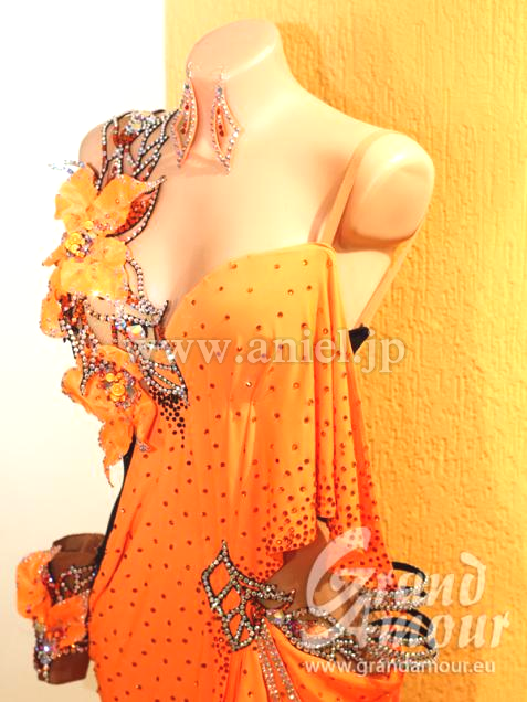 胸元とヒップにはハンドメイドの立体モチーフとレースモチーフが付けられとても個性的、ドレープには全体にストーンが散りばめられていて華やかです。