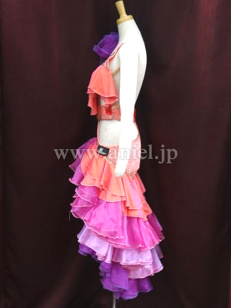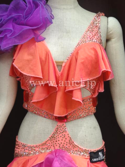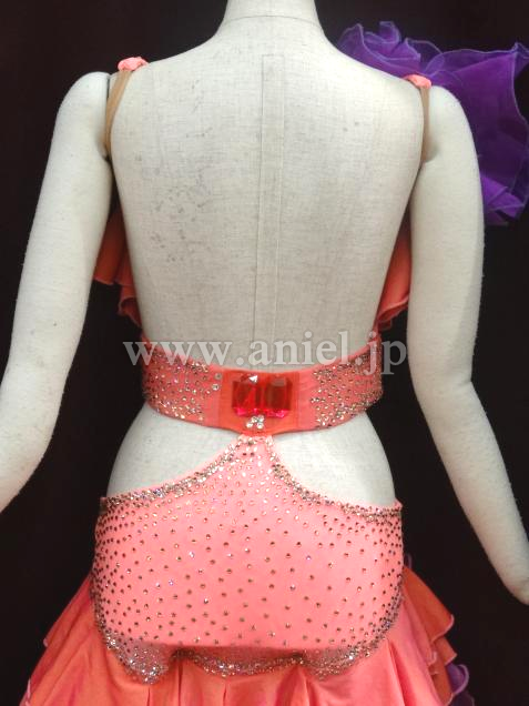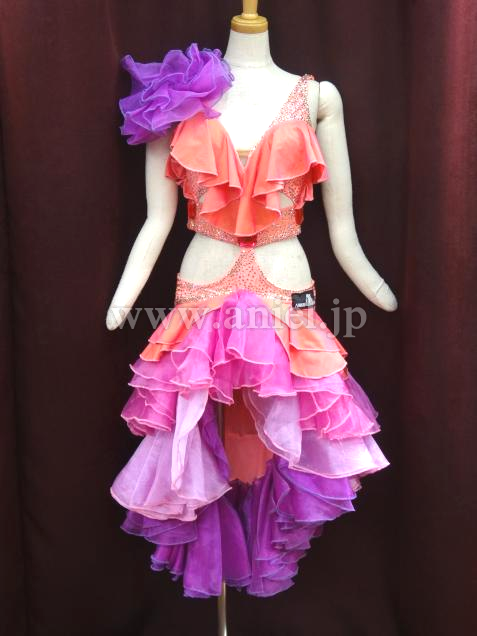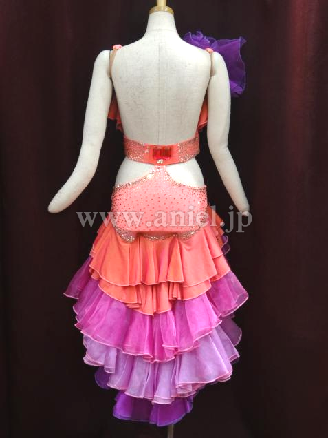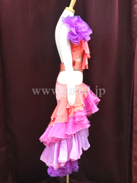 肩の立体モチーフと胸元のフリルが視線を上に集めるので下に重くなりすぎません。