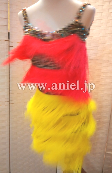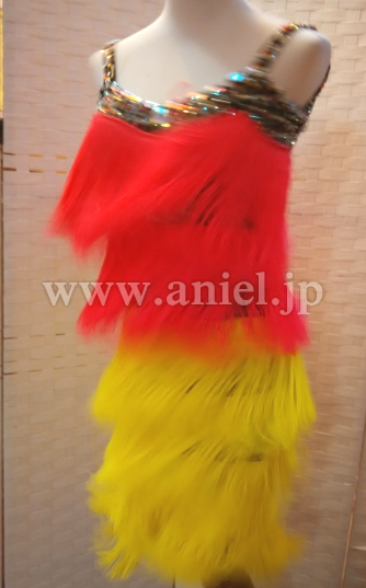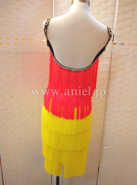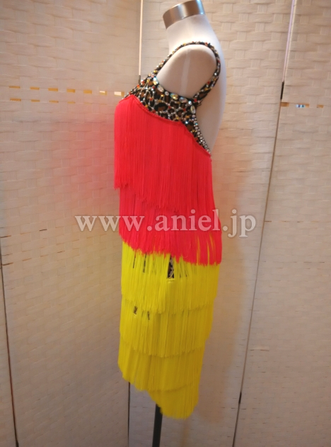 鮮やかなクリスアンの黄色とオレンジのフリンジラテンドレスです。