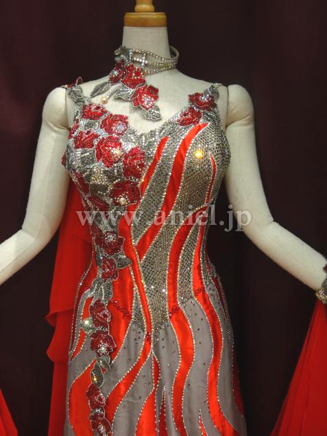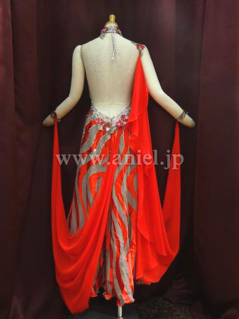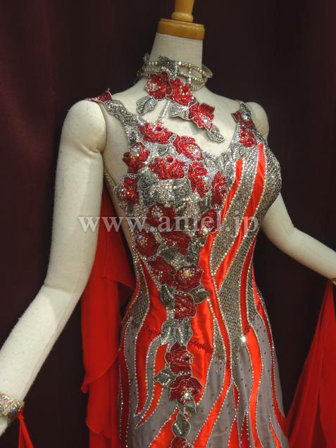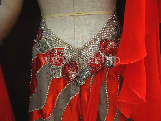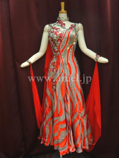 赤とグレーの波状の柄が、絶妙に絡み合った、大変、インパクトのあるドレスです。