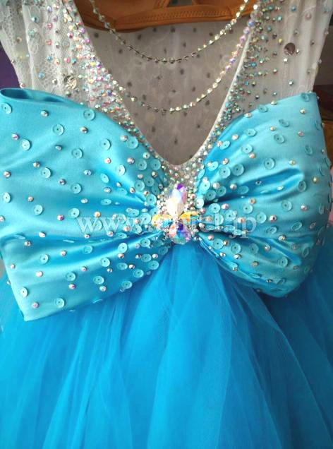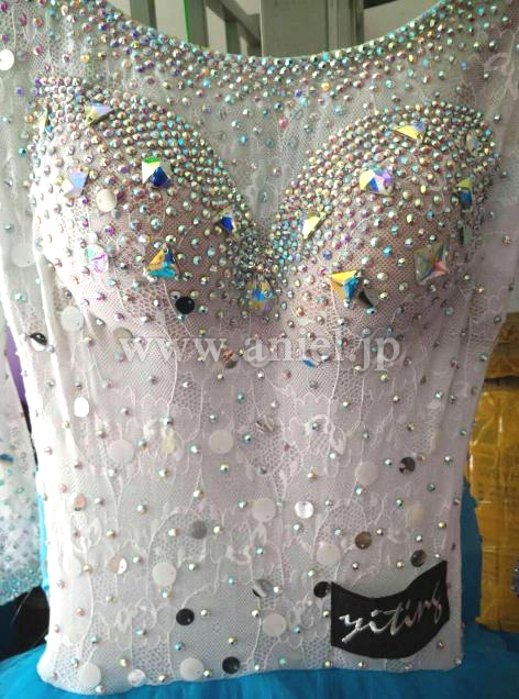 レース生地のボディはスワロフスキーストーンやスパンコールで装飾されています。2色のリボンフロートがキュートです。