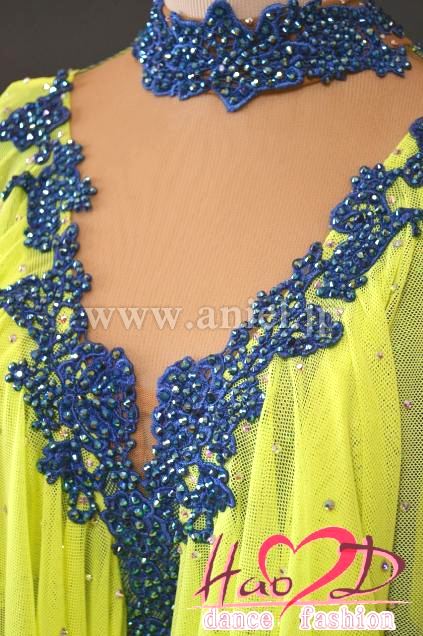 ★身頃のネットに青い竹ビーズを満遍なく縫い付け、ボリュームと豪華さアップ;