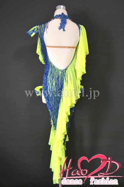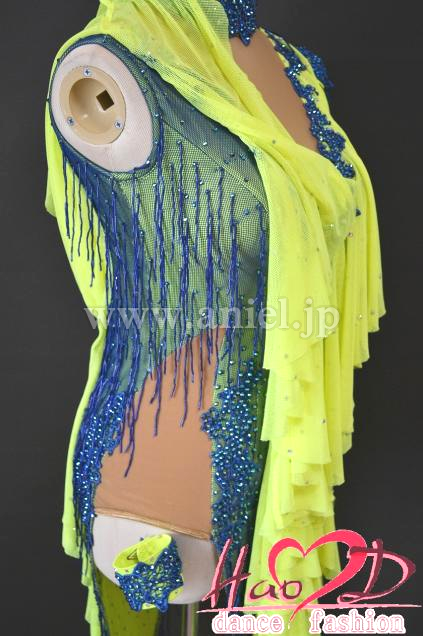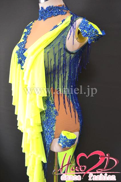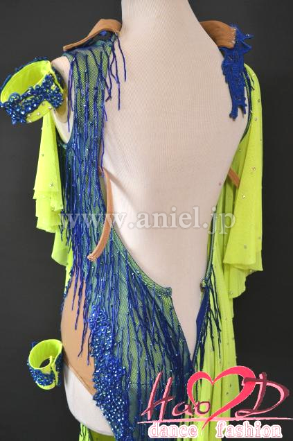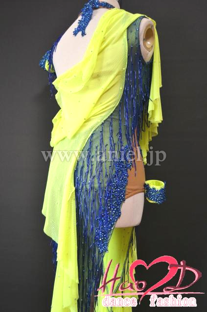 ★身頃は黄緑色のライクラ生地をベースに、網目の大きめの紺色ネットを被せ、引き締まりのあるコントラストカラー;