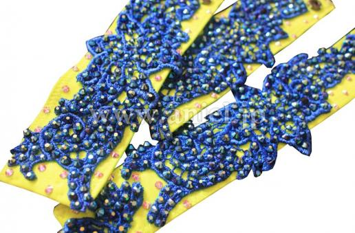 ★青い手縫いモチーフにブルーオーロラ色のプレシオサー石を密集して貼り付けて立体感を出す;