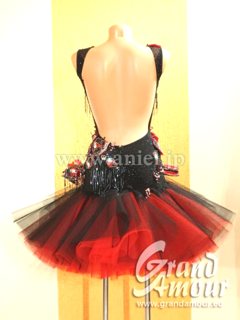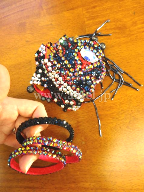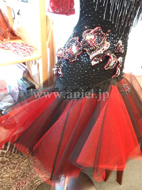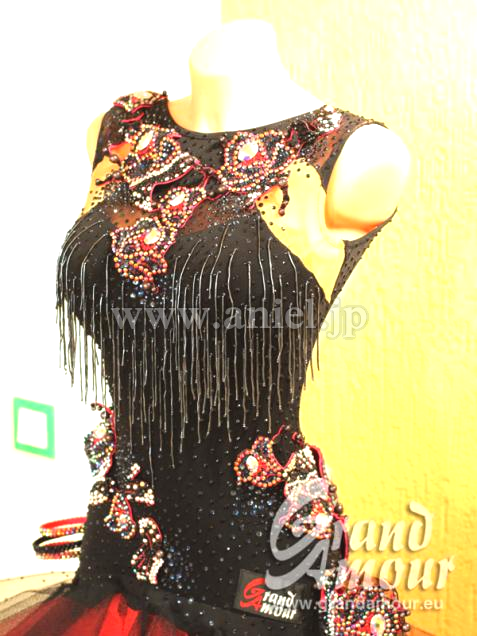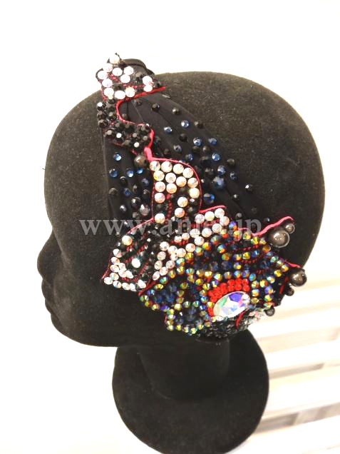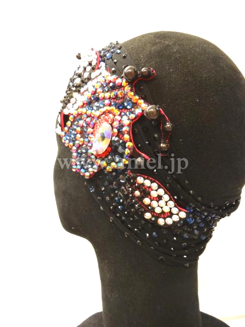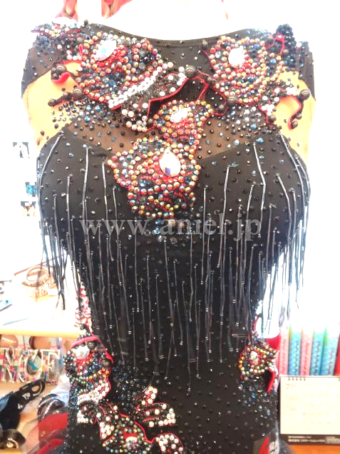 ボディは黒のクレープ生地にビーズフリンジ・立体のモチーフなど、装飾がふんだんに付けられた芸術的なドレスです。可愛らしいデザインですが、ストロングなカラーとモチーフで、ラテンらしさを強調しています。モチーフにはカラフルな石が芸術的に配置されていて、面白い輝きを放ちます。二つの腕輪と、個性的なバングル、それからゴージャスなヘアバンドが付属しています。