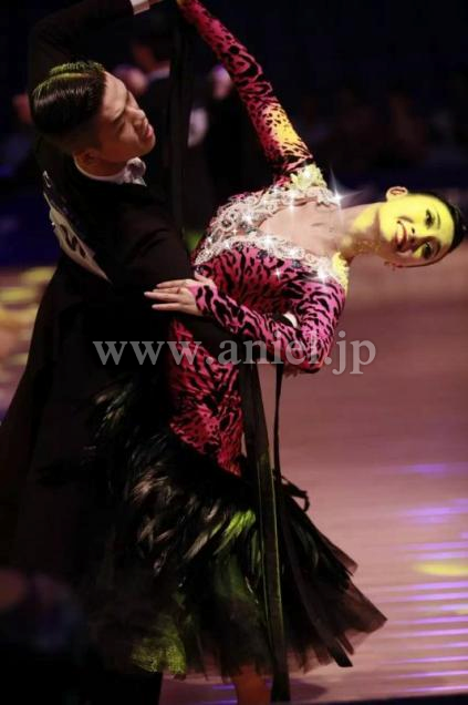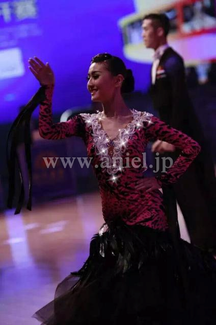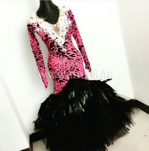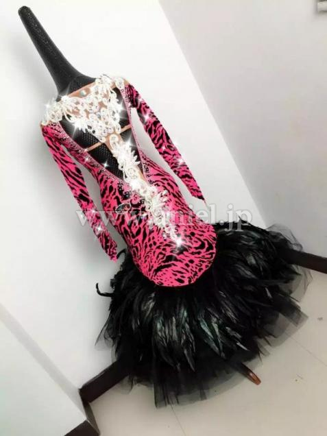 インパクトのある赤の豹柄ボディに黒の羽根スカートが存在感を出すドレスです。