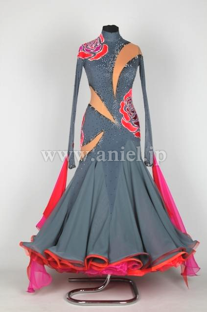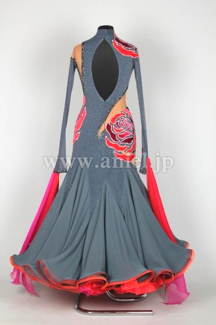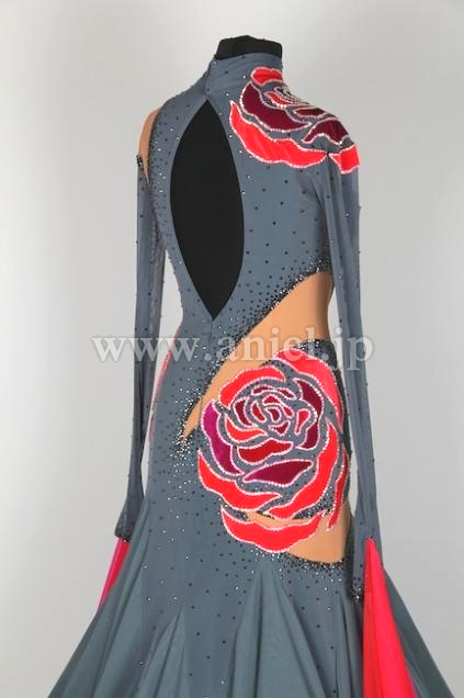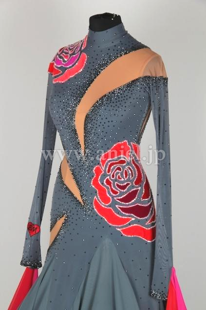 表地はグレーで赤バラが豪華なアクセントになっており、裏地は赤のチュールがたっぷり。スカートの動きがEMドレスの中でも群を抜いて凄いです!
