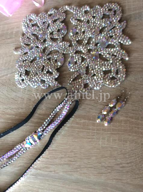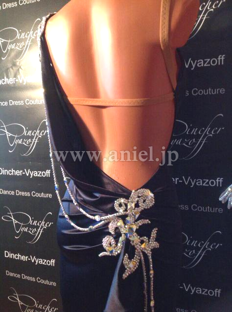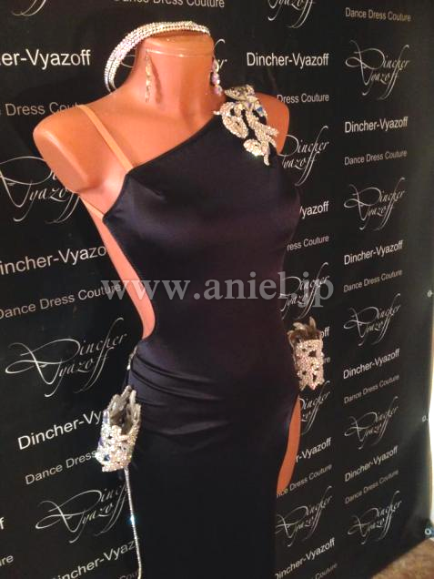 黒のシンプルながらも洗練されたラインにDincherらしいスワロフスキーストーンびっしりな豪華なモチーフやバングルがゴージャスなドレスです。